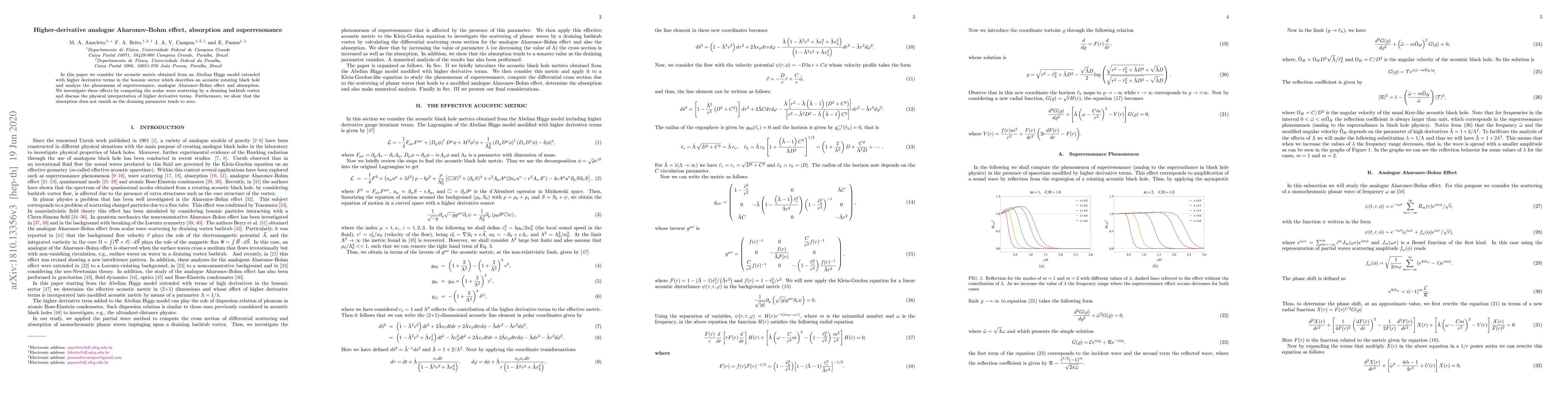 This paper explores the acoustic metric from an extended Abelian Higgs model with higher-derivative terms, focusing on superresonance, analogue Aharonov-Bohm effect, and absorption in an acoustic rotating black hole. The study uses scalar wave scattering by a draining bathtub vortex to analyze these phenomena, revealing that absorption persists even as the draining parameter approaches zero.