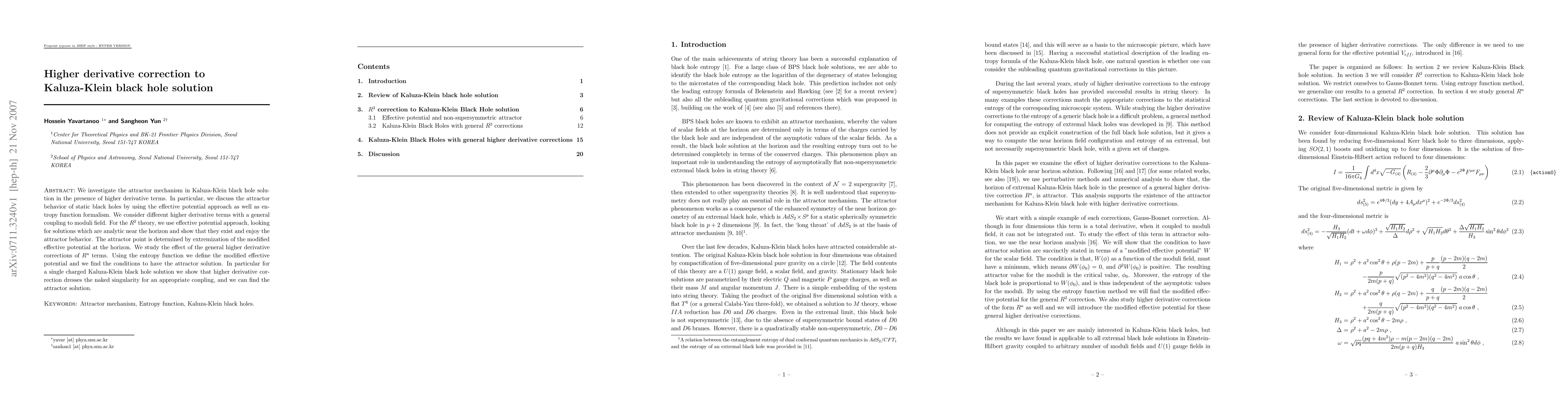 This paper examines the attractor mechanism in Kaluza-Klein black holes with higher derivative corrections, using effective potential and entropy function formalism. It finds that higher derivative terms, particularly $R^2$ and $R^n$, can lead to attractor behavior and potentially dress naked singularities under specific coupling conditions.