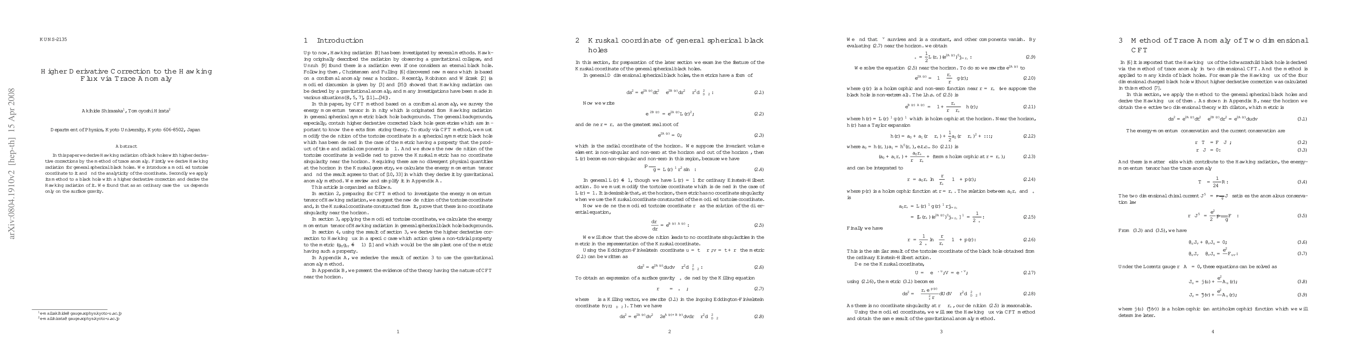 This paper derives Hawking radiation for black holes with higher derivative corrections using the trace anomaly method, finding that the flux depends on surface gravity, similar to ordinary cases, but with modifications due to the introduced higher derivative terms.