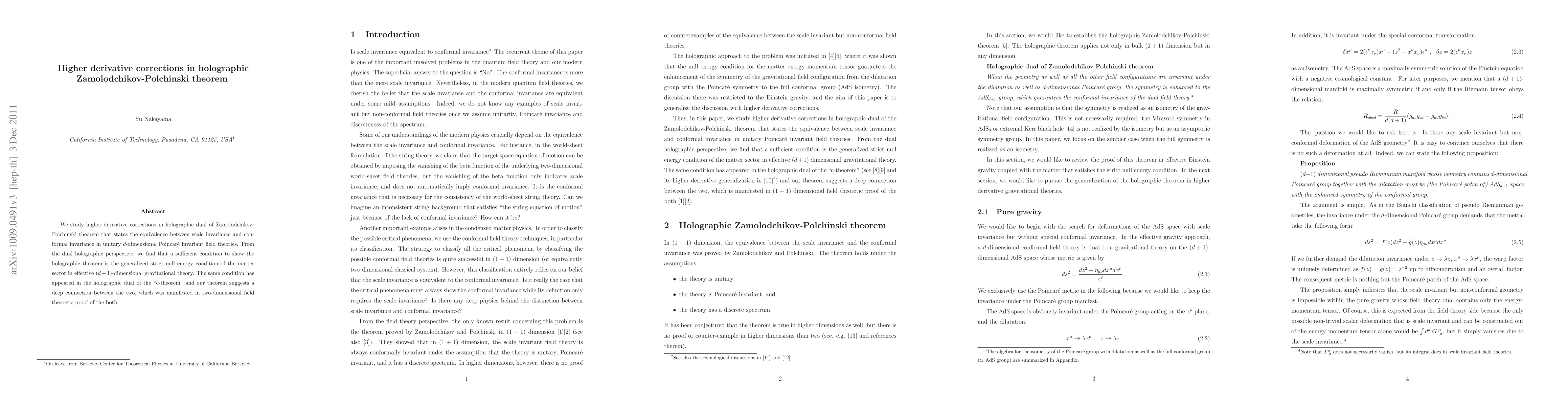 This paper investigates higher derivative corrections in the holographic dual of the Zamolodchikov-Polchinski theorem, establishing equivalence between scale and conformal invariance in d-dimensional field theories. It finds that a generalized strict null energy condition in the effective (d+1)-dimensional gravitational theory is sufficient to prove the theorem, revealing a connection to the holographic "c-theorem."