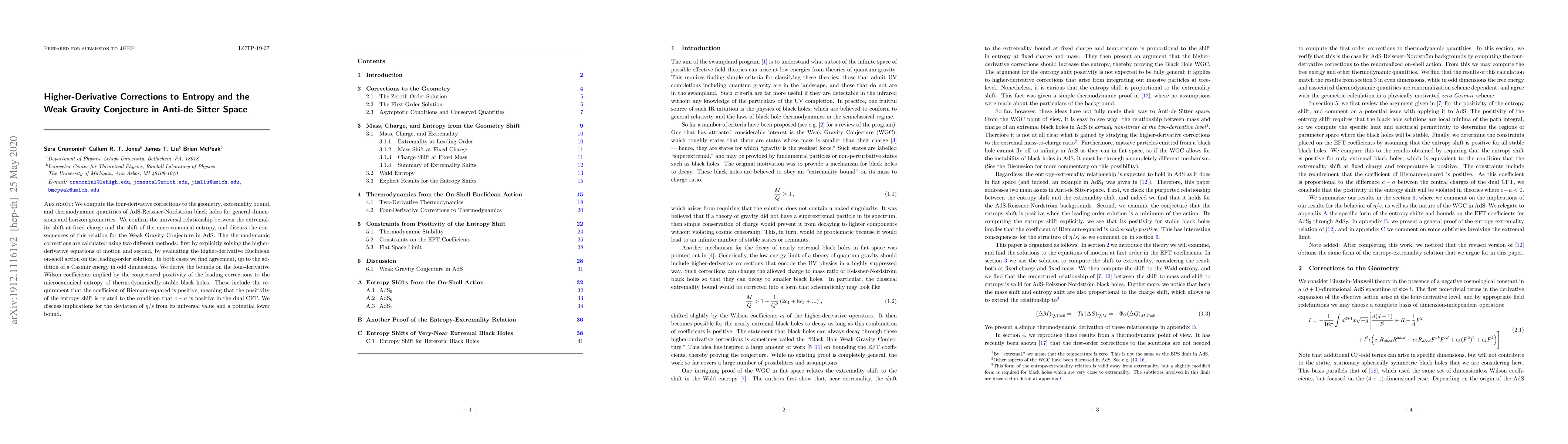 We compute the four-derivative corrections to the geometry, extremality bound, and thermodynamic quantities of AdS-Reissner-Nordstr{\"o}m black holes for general dimensions and horizon geometries. We confirm the universal relationship between the extremality shift at fixed charge and the shift of the microcanonical entropy, and discuss the consequences of this relation for the Weak Gravity Conjecture in AdS. The thermodynamic corrections are calculated using two different methods: first by explicitly solving the higher-derivative equations of motion and second, by evaluating the higher-derivative Euclidean on-shell action on the leading-order solution. In both cases we find agreement, up to the addition of a Casimir energy in odd dimensions. We derive the bounds on the four-derivative Wilson coefficients implied by the conjectured positivity of the leading corrections to the microcanonical entropy of thermodynamically stable black holes. These include the requirement that the coefficient of Riemann-squared is positive, meaning that the positivity of the entropy shift is related to the condition that $c - a$ is positive in the dual CFT. We discuss implications for the deviation of $\eta/s$ from its universal value and a potential lower bound.