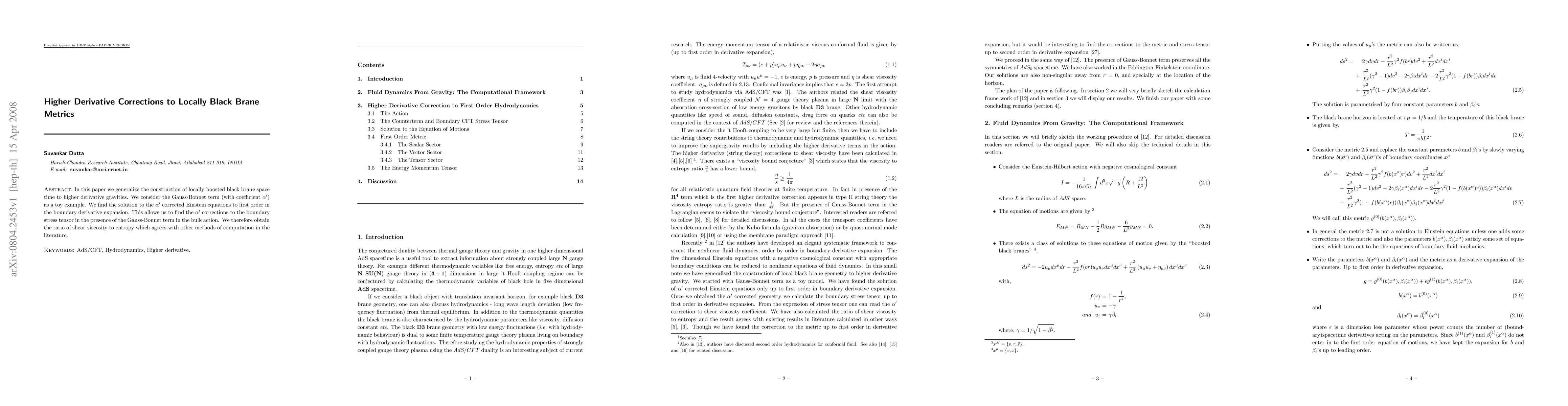 In this paper we generalize the construction of locally boosted black brane space time to higher derivative gravities. We consider the Gauss-Bonnet term (with coefficient $\alpha'$) as a toy example. We find the solution to the $\alpha'$ corrected Einstein equations to first order in the boundary derivative expansion. This allows us to find the $\alpha'$ corrections to the boundary stress tensor in the presence of the Gauss-Bonnet term in the bulk action. We therefore obtain the ratio of shear viscosity to entropy which agrees with other methods of computation in the literature.