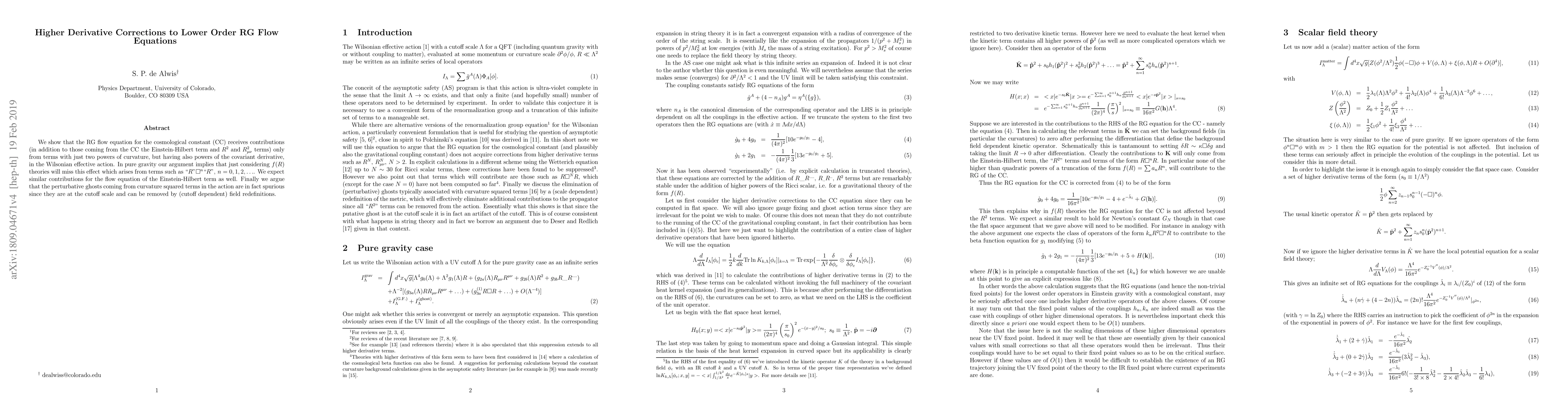 We show that the RG flow equation for the cosmological constant (CC) receives contributions (in addition to those coming from the CC the Einstein-Hilbert term and $R^{2}$ and $R_{\mu\nu}^{2}$ terms) only from terms with just two powers of curvature, but having also powers of the covariant derivative, in the Wilsonian effective action. In pure gravity our argument implies that just considering $f(R)$ theories will miss this effect which arises from terms such as $"R"\square^{n}"R",\,n=0,1,2,\ldots$. We expect similar contributions for the flow equation of the Einstein-Hilbert term as well. Finally we argue that the perturbative ghosts coming from curvature squared terms in the action are in fact spurious since they are at the cutoff scale and can be removed by (cutoff dependent) field redefinitions.