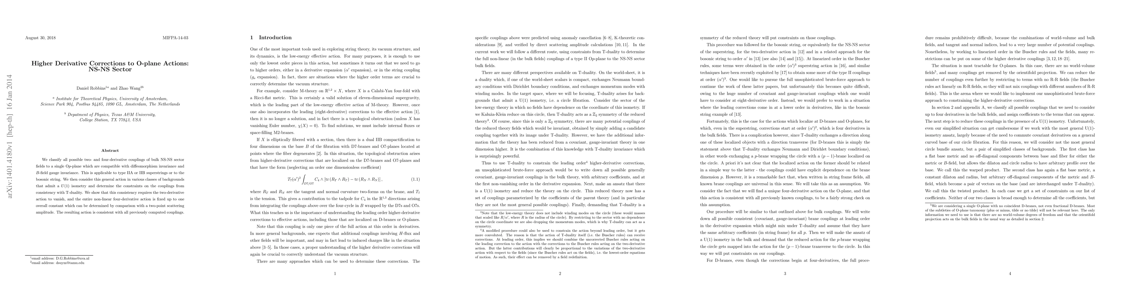 This paper classifies higher derivative corrections to O-plane actions in the NS-NS sector, focusing on two- and four-derivative couplings compatible with diffeomorphism and B-field gauge invariance. It determines the constraints on these couplings from T-duality, showing that the two-derivative action must vanish and fixing the four-derivative action up to a constant, consistent with previous results.