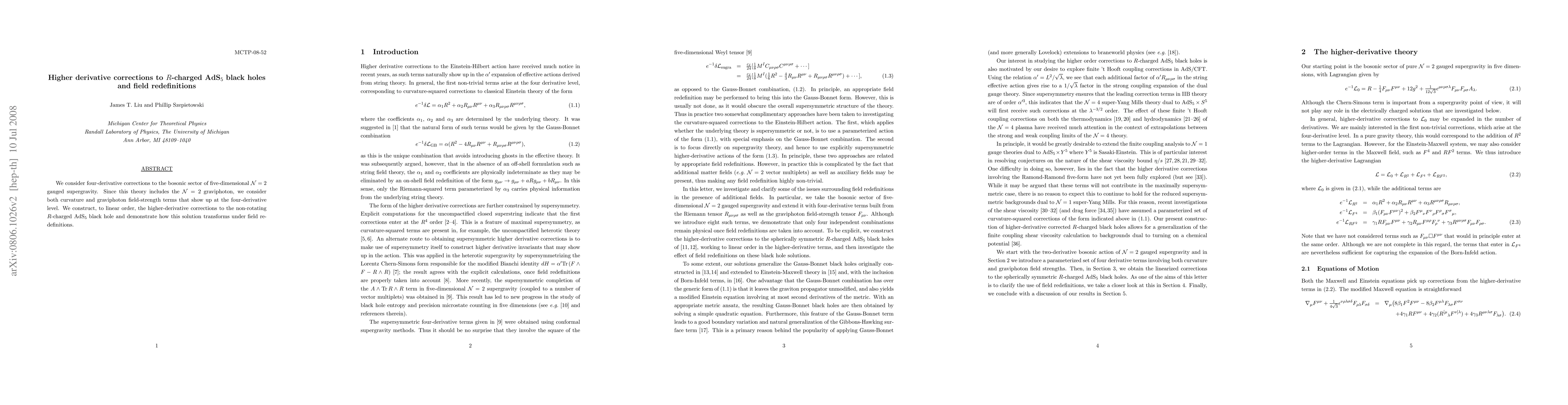 This paper investigates four-derivative corrections in the bosonic sector of five-dimensional N=2 gauged supergravity, focusing on both curvature and graviphoton terms. It constructs higher-derivative corrections to the non-rotating R-charged AdS_5 black hole and examines the transformation of this solution under field redefinitions.