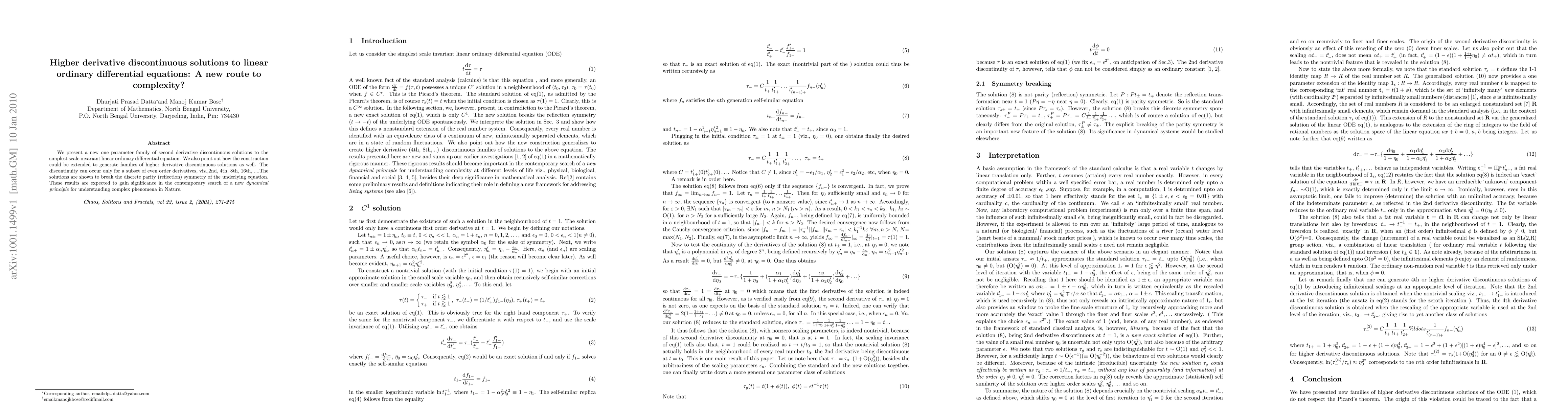 This paper introduces a novel family of second derivative discontinuous solutions to a simple linear ordinary differential equation, extending to higher-order derivatives. These solutions break the discrete parity symmetry and may contribute to understanding complex natural phenomena.