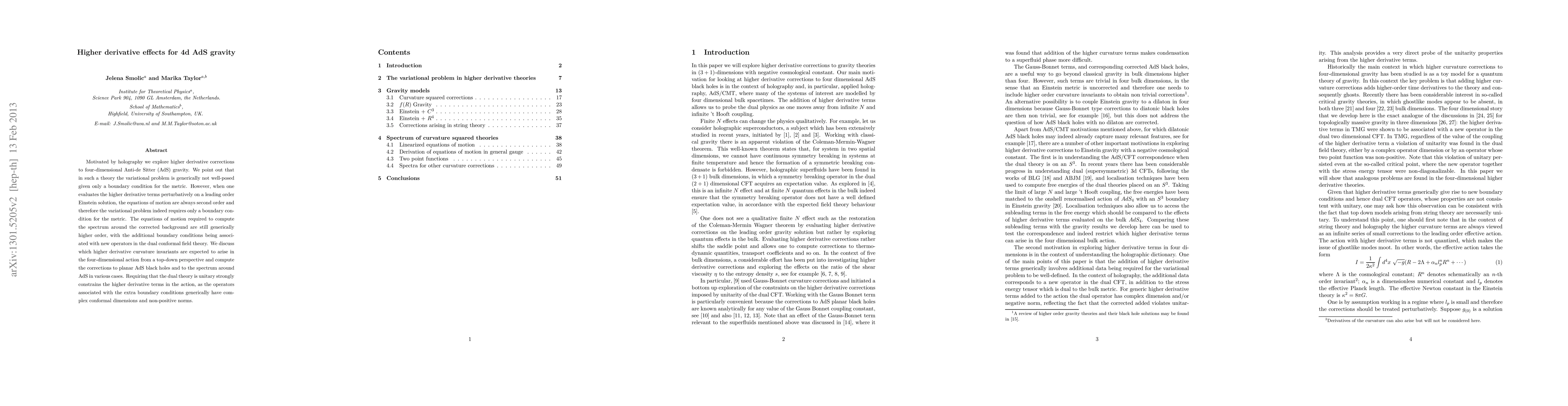 Motivated by holography, we explore higher derivative corrections to four-dimensional Anti-de Sitter (AdS) gravity. We point out that in such a theory the variational problem is generically not well-posed given only a boundary condition for the metric. However, when one evaluates the higher derivative terms perturbatively on a leading order Einstein solution, the equations of motion are always second order and therefore the variational problem indeed requires only a boundary condition for the metric. The equations of motion required to compute the spectrum around the corrected background are still generically higher order, with the additional boundary conditions being associated with new operators in the dual conformal field theory. We discuss which higher derivative curvature invariants are expected to arise in the four-dimensional action from a top-down perspective and compute the corrections to planar AdS black holes and to the spectrum around AdS in various cases. Requiring that the dual theory is unitary strongly constrains the higher derivative terms in the action, as the operators associated with the extra boundary conditions generically have complex conformal dimensions and non-positive norms.