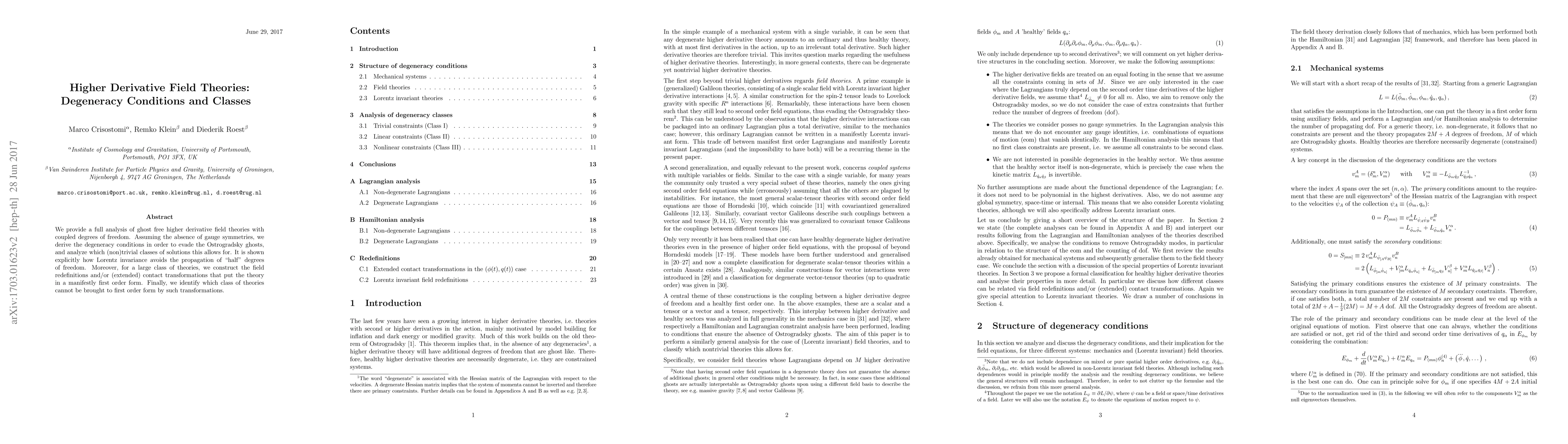 We provide a full analysis of ghost free higher derivative field theories with coupled degrees of freedom. Assuming the absence of gauge symmetries, we derive the degeneracy conditions in order to evade the Ostrogradsky ghosts, and analyze which (non)trivial classes of solutions this allows for. It is shown explicitly how Lorentz invariance avoids the propagation of "half" degrees of freedom. Moreover, for a large class of theories, we construct the field redefinitions and/or (extended) contact transformations that put the theory in a manifestly first order form. Finally, we identify which class of theories cannot be brought to first order form by such transformations.