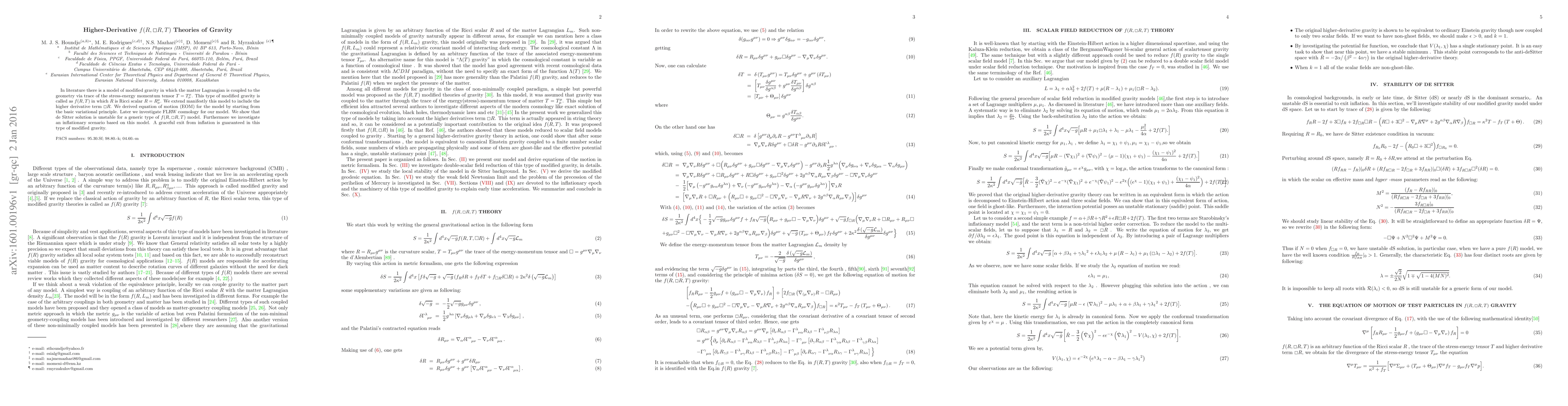 This paper extends $f(R,T)$ gravity to include higher-derivative terms $\Box R$, deriving the equations of motion and investigating FLRW cosmology. It finds de Sitter solutions unstable and demonstrates inflationary scenarios with a graceful exit from inflation.