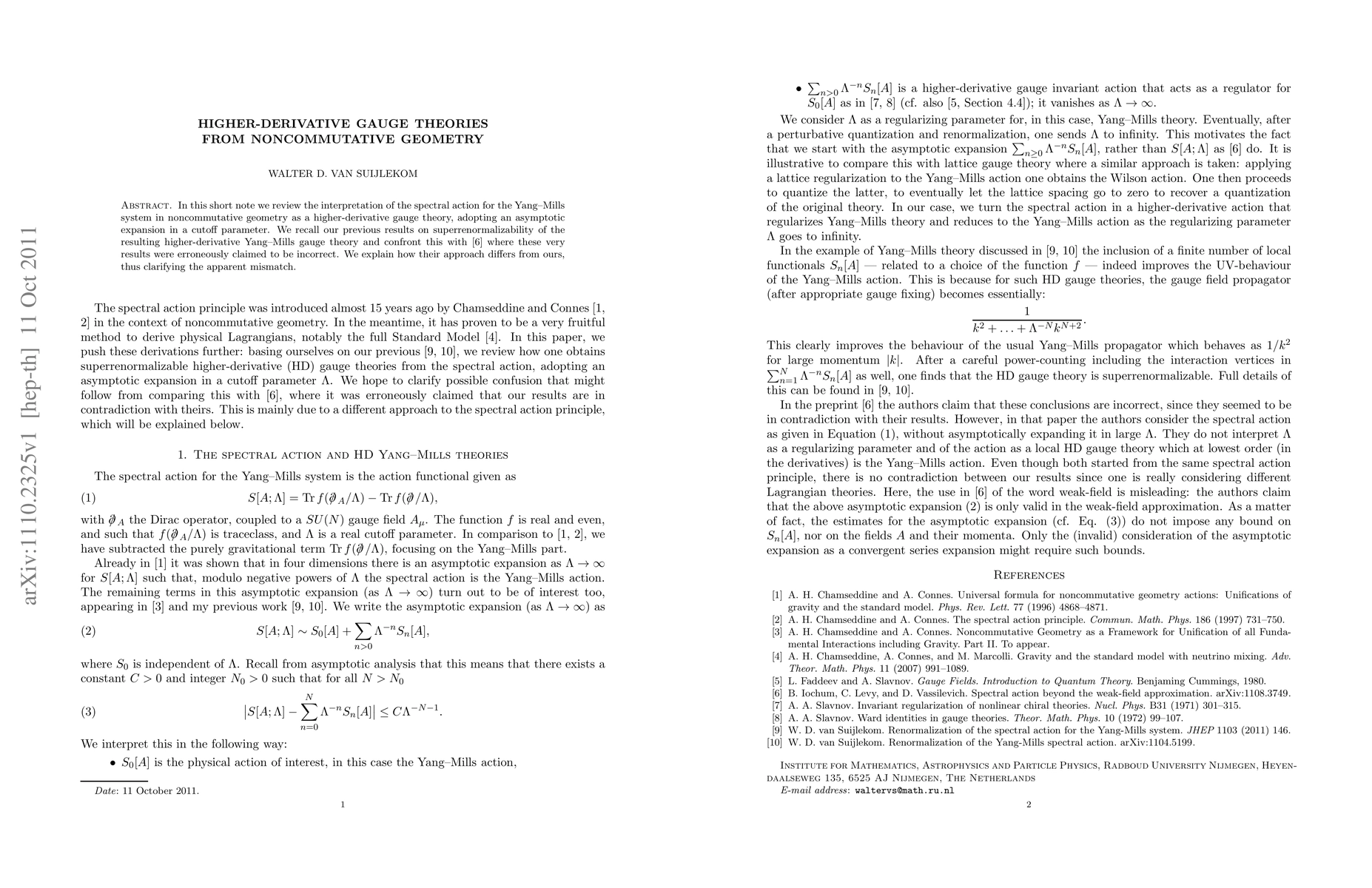 In this short note we review the interpretation of the spectral action for the Yang-Mills system in noncommutative geometry as a higher-derivative gauge theory, adopting an asymptotic expansion in a cutoff parameter. We recall our previous results on superrenormalizability of the resulting higher-derivative Yang-Mills gauge theory and confront this with [6] where these very results were erroneously claimed to be incorrect. We explain how their approach differs from ours, thus clarifying the apparent mismatch.