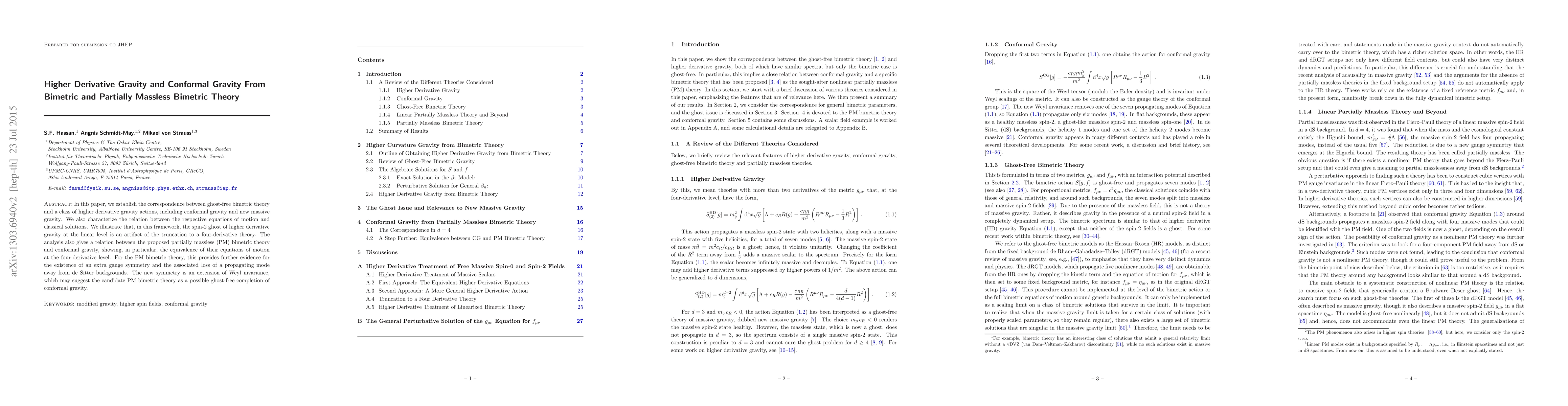 This paper demonstrates the correspondence between ghost-free bimetric theory and higher derivative gravity, including conformal gravity, by showing that the spin-2 ghost in higher derivative gravity is an artifact of truncation. It also establishes the equivalence between partially massless bimetric theory and conformal gravity, indicating an extra gauge symmetry in the latter.