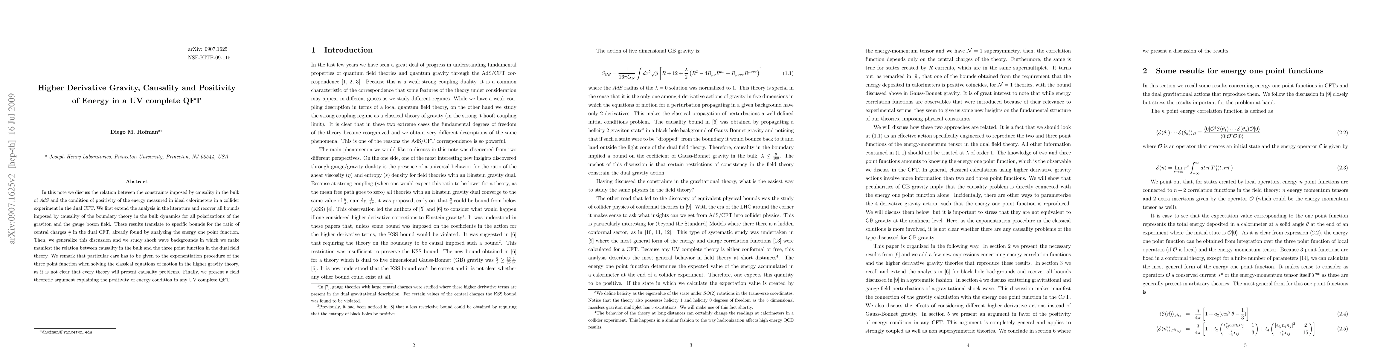 In this note we discuss the relation between the constraints imposed by causality in the bulk of $AdS$ and the condition of positivity of the energy measured in ideal calorimeters in a collider experiment in the dual CFT. We first extend the analysis in the literature and recover all bounds imposed by causality of the boundary theory in the bulk dynamics for all polarizations of the graviton and the gauge boson field. These results translate to specific bounds for the ratio of central charges $\frac{a}{c}$ in the dual CFT, already found by analyzing the energy one point function. Then, we generalize this discussion and we study shock wave backgrounds in which we make manifest the relation between causality in the bulk and the three point function in the dual field theory. We remark that particular care has to be given to the exponentiation procedure of the three point function when solving the classical equations of motion in the higher gravity theory, as it is not clear that every theory will present causality problems. Finally, we present a field theoretic argument explaining the positivity of energy condition in any UV complete QFT.
