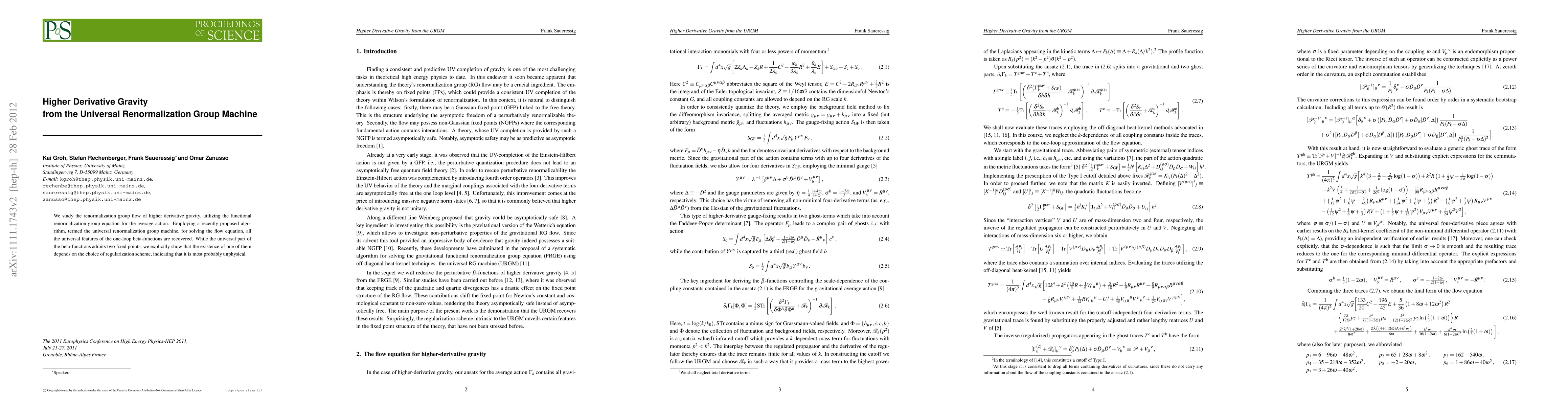 This paper investigates the renormalization group flow of higher derivative gravity using the functional renormalization group equation and a new universal renormalization group machine algorithm. It finds two fixed points in the universal part of the beta-functions, but suggests that one likely depends on the regularization scheme and is thus probably unphysical.