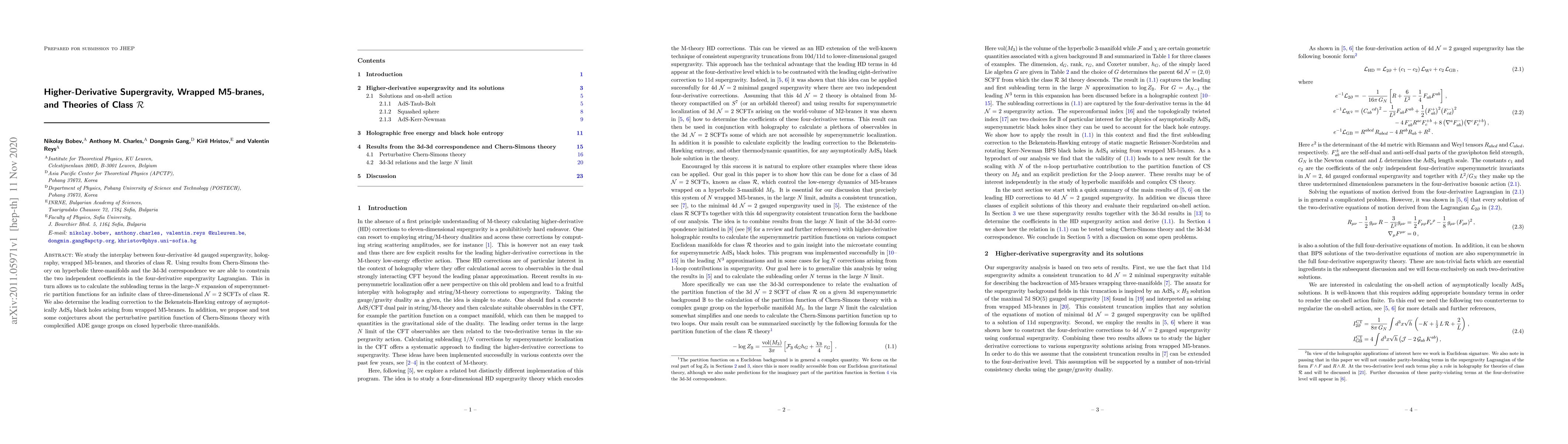 This paper investigates the relationship between four-derivative supergravity, wrapped M5-branes, and theories of class $\mathcal{R}$, using results from Chern-Simons theory to constrain coefficients and compute partition functions for $\mathcal{N}=2$ SCFTs. It also determines the leading entropy correction for AdS$_4$ black holes from M5-branes and tests conjectures regarding Chern-Simons theory on hyperbolic manifolds.