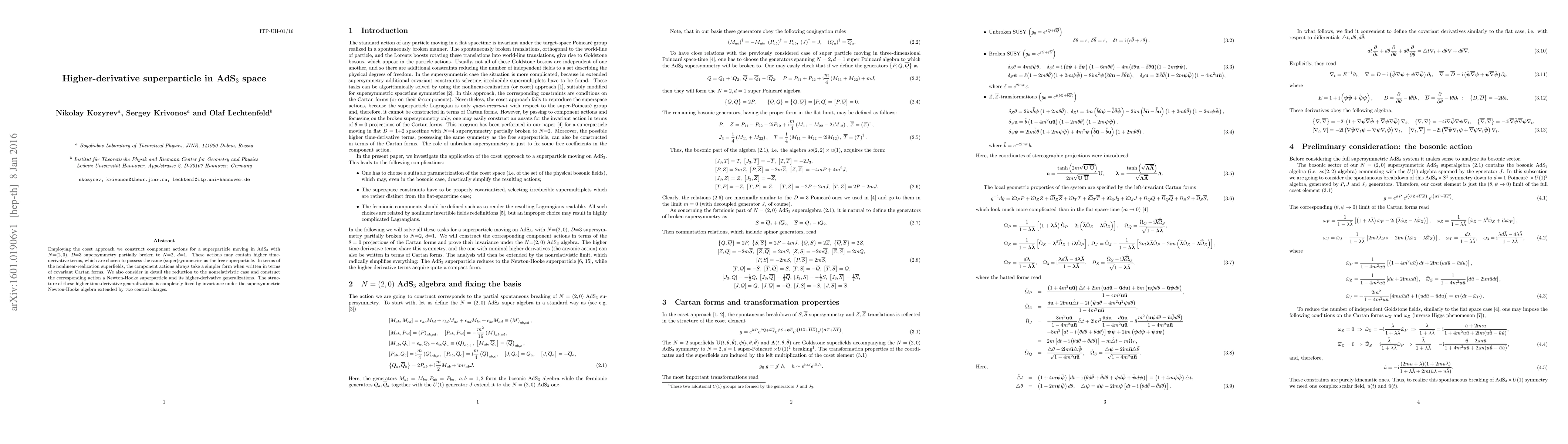 Employing the coset approach we construct component actions for a superparticle moving in AdS$_3$ with $N{=}(2,0)$, $D{=}3$ supersymmetry partially broken to $N{=}2$, $d{=}1$. These actions may contain higher time-derivative terms, which are chosen to possess the same (super)symmetries as the free superparticle. In terms of the nonlinear-realization superfields, the component actions always take a simpler form when written in terms of covariant Cartan forms. We also consider in detail the reduction to the nonrelativistic case and construct the corresponding action a Newton-Hooke superparticle and its higher-derivative generalizations. The structure of these higher time-derivative generalizations is completely fixed by invariance under the supersymmetric Newton-Hooke algebra extended by two central charges.
