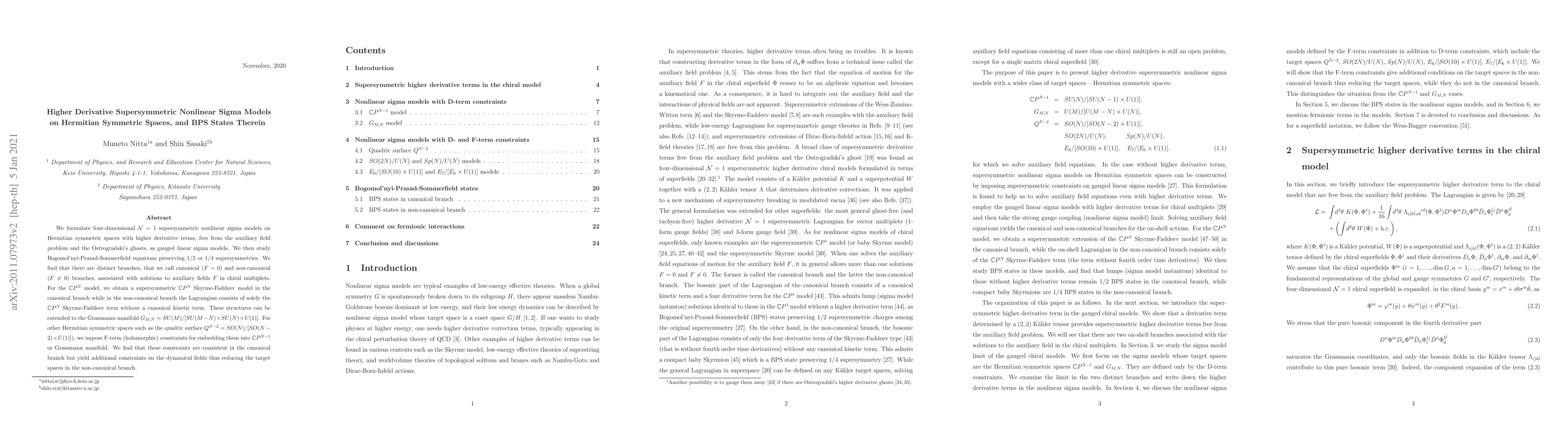 We formulate four-dimensional $\mathcal{N} = 1$ supersymmetric nonlinear sigma models on Hermitian symmetric spaces with higher derivative terms, free from the auxiliary field problem and the Ostrogradski's ghosts, as gauged linear sigma models. We then study Bogomol'nyi-Prasad-Sommerfield equations preserving 1/2 or 1/4 supersymmetries. We find that there are distinct branches, that we call canonical ($F=0$) and non-canonical ($F\neq 0$) branches, associated with solutions to auxiliary fields $F$ in chiral multiplets. For the ${\mathbb C}P^N$ model, we obtain a supersymmetric ${\mathbb C}P^N$ Skyrme-Faddeev model in the canonical branch while in the non-canonical branch the Lagrangian consists of solely the ${\mathbb C}P^N$ Skyrme-Faddeev term without a canonical kinetic term. These structures can be extended to the Grassmann manifold $G_{M,N} = SU(M)/[SU(M-N)\times SU(N) \times U(1)]$. For other Hermitian symmetric spaces such as the quadric surface $Q^{N-2}=SO(N)/[SO(N-2) \times U(1)])$, we impose F-term (holomorphic) constraints for embedding them into ${\mathbb C}P^{N-1}$ or Grassmann manifold. We find that these constraints are consistent in the canonical branch but yield additional constraints on the dynamical fields thus reducing the target spaces in the non-canonical branch.