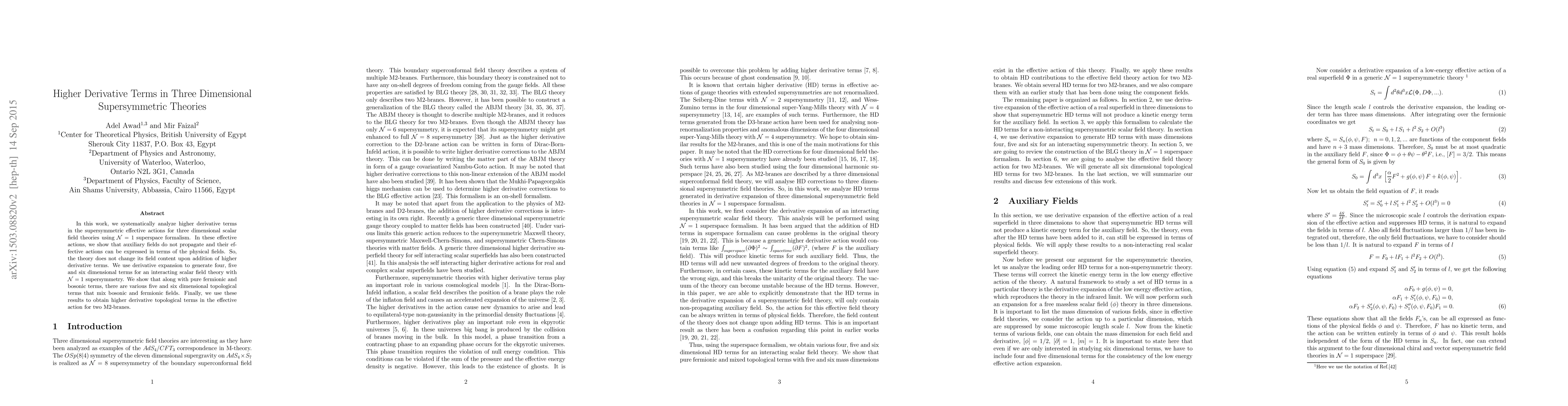 This paper systematically investigates higher derivative terms in three-dimensional supersymmetric scalar field theories using $\mathcal{N} =1$ superspace, demonstrating that auxiliary fields do not propagate and the field content remains unchanged. The study generates higher derivative terms and identifies various topological terms that mix bosonic and fermionic fields, culminating in the derivation of higher derivative topological terms for two M2-branes.