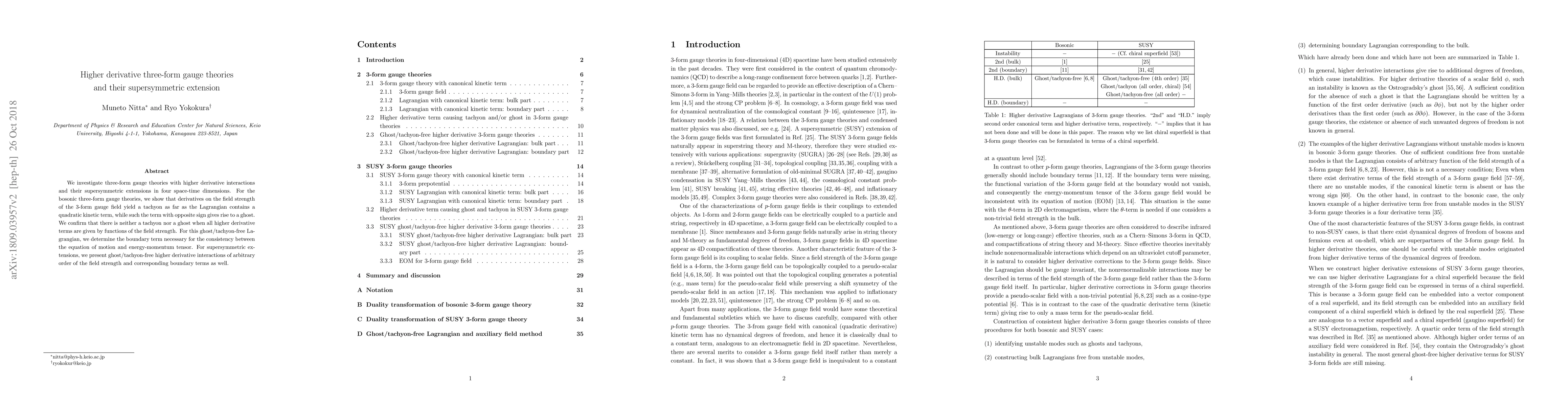 This paper explores three-form gauge theories with higher derivative interactions, demonstrating that bosonic versions with quadratic kinetic terms yield tachyons or ghosts, while those involving functions of the field strength avoid such issues. It also extends these findings to supersymmetric formulations, presenting ghost/tachyon-free higher derivative interactions and necessary boundary terms.