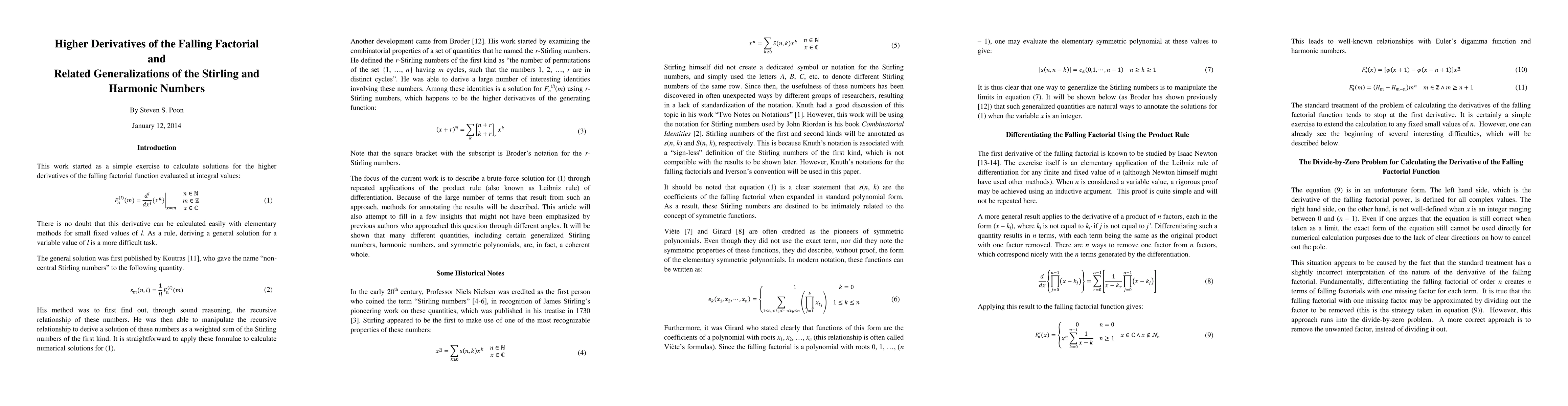 Through a brute-force approach to calculating the higher derivatives of the falling factorial function, a number of interesting quantities were obtained and analyzed. In particular, it was found that a quantity that can be described as the "elementary symmetric harmonic sum" is a natural way to describe the solutions to such higher derivatives. The relationship of this type of generalized harmonic number to other quantities discussed in the literature, such as the r-Stirling numbers, was described in detail.