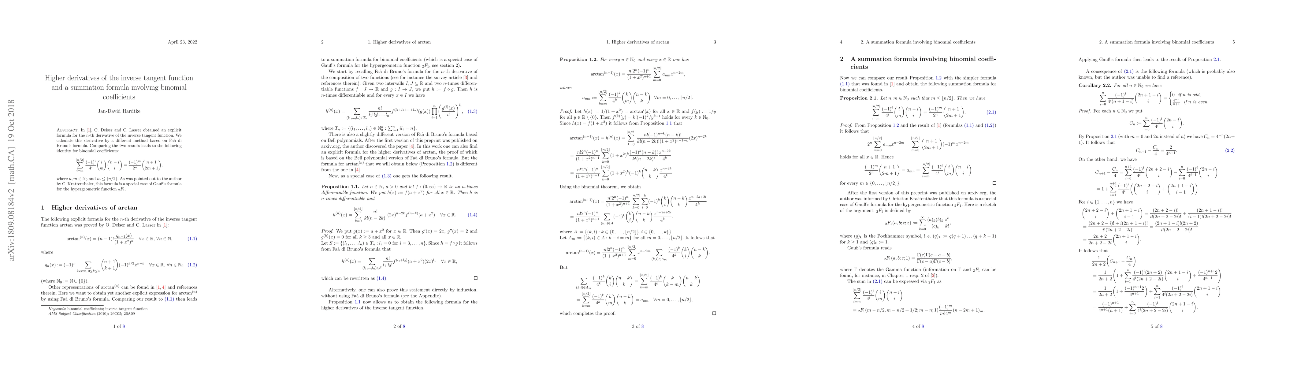 In 2017, O. Deiser and C. Lasser obtained an explicit formula for the $n$-th derivative of the inverse tangent function. We calculate this derivative by a different method based on Fa\`a di Bruno's formula. Comparing the two results leads to the following identity for binomial coefficients: $$\sum_{i=m}^{[n/2]}\frac{(-1)^i}{4^i}\binom{i}{m}\binom{n-i}{i}=\frac{(-1)^m}{2^n}\binom{n+1}{2m+1},$$ where $n,m\in \mathbb{N}_0$ and $m\leq [n/2]$. As was pointed out to the author by C. Krattenthaler, this formula is a special case of Gau\ss's formula for the hypergeometric function $_2F_1$.