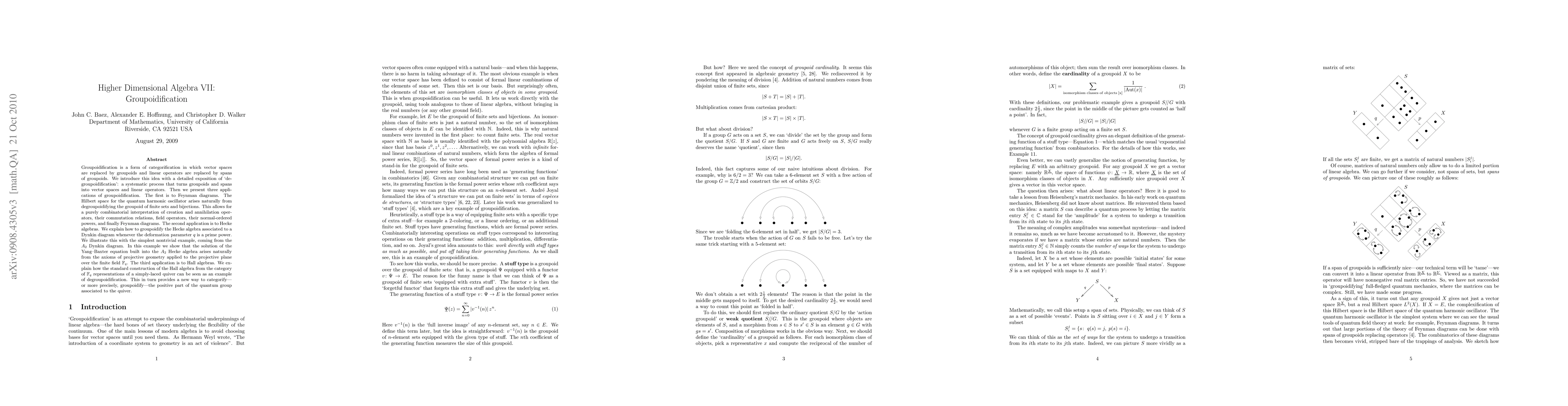 Groupoidification is a form of categorification in which vector spaces are replaced by groupoids, and linear operators are replaced by spans of groupoids. We introduce this idea with a detailed exposition of "degroupoidification": a systematic process that turns groupoids and spans into vector spaces and linear operators. Then we present three applications of groupoidification. The first is to Feynman diagrams. The Hilbert space for the quantum harmonic oscillator arises naturally from degroupoidifying the groupoid of finite sets and bijections. This allows for a purely combinatorial interpretation of creation and annihilation operators, their commutation relations, field operators, their normal-ordered powers, and finally Feynman diagrams. The second application is to Hecke algebras. We explain how to groupoidify the Hecke algebra associated to a Dynkin diagram whenever the deformation parameter q is a prime power. We illustrate this with the simplest nontrivial example, coming from the A2 Dynkin diagram. In this example we show that the solution of the Yang-Baxter equation built into the A2 Hecke algebra arises naturally from the axioms of projective geometry applied to the projective plane over the finite field with q elements. The third application is to Hall algebras. We explain how the standard construction of the Hall algebra from the category of representations of a simply-laced quiver can be seen as an example of degroupoidification. This in turn provides a new way to categorify - or more precisely, groupoidify - the positive part of the quantum group associated to the quiver.