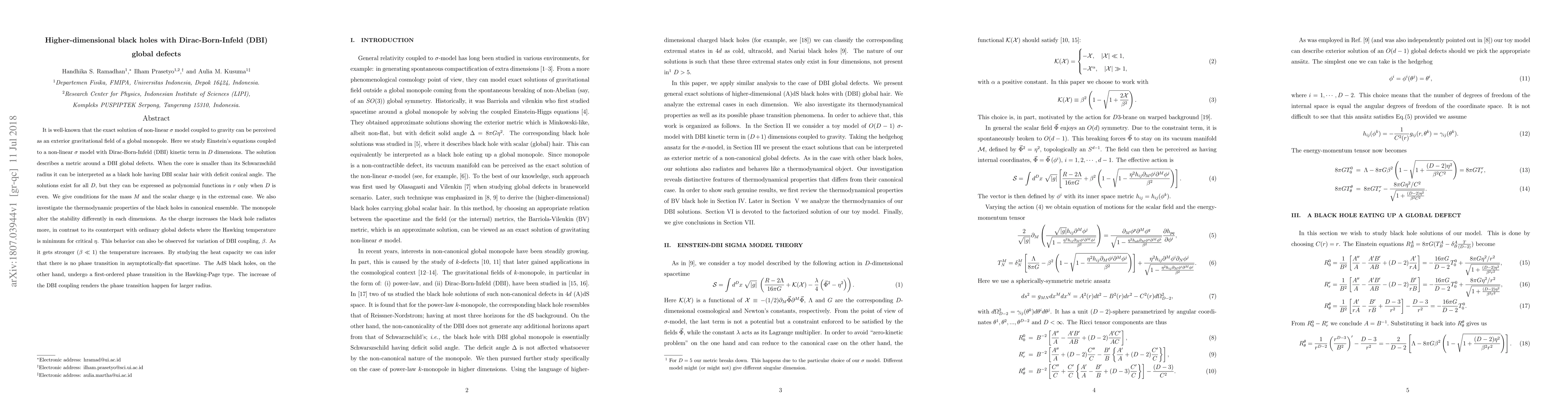 It is well-known that the exact solution of non-linear $\sigma$ model coupled to gravity can be perceived as an exterior gravitational field of a global monopole. Here we study Einstein's equations coupled to a non-linear $\sigma$ model with Dirac-Born-Infeld (DBI) kinetic term in $D$ dimensions. The solution describes a metric around a DBI global defects. When the core is smaller than its Schwarzschild radius it can be interpreted as a black hole having DBI scalar hair with deficit conical angle. The solutions exist for all $D$, but they can be expressed as polynomial functions in $r$ only when $D$ is even. We give conditions for the mass $M$ and the scalar charge $\eta$ in the extremal case. We also investigate the thermodynamic properties of the black holes in canonical ensemble. The monopole alter the stability differently in each dimensions. As the charge increases the black hole radiates more, in contrast to its counterpart with ordinary global defects where the Hawking temperature is minimum for critical $\eta$. This behavior can also be observed for variation of DBI coupling, $\beta$. As it gets stronger ($\beta\ll1$) the temperature increases. By studying the heat capacity we can infer that there is no phase transition in asymptotically-flat spacetime. The AdS black holes, on the other hand, undergo a first-ordered phase transition in the Hawking-Page type. The increase of the DBI coupling renders the phase transition happen for larger radius.