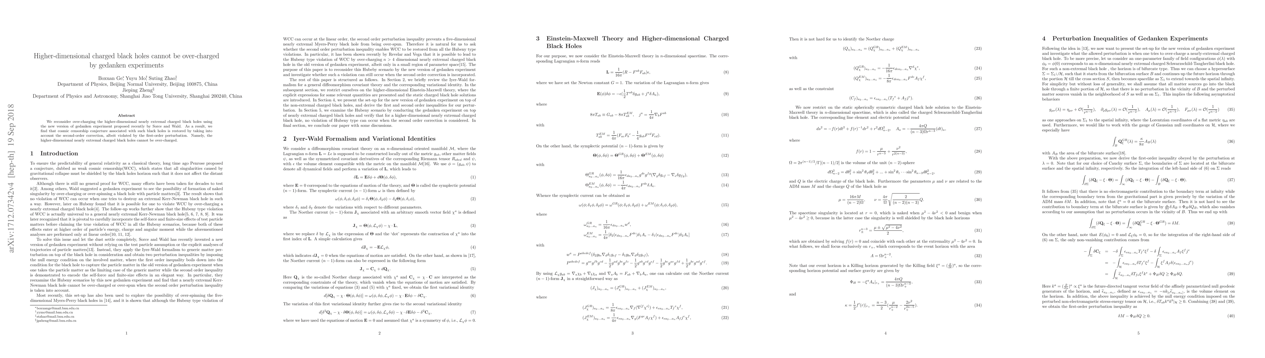 This paper concludes that higher-dimensional nearly extremal charged black holes cannot be over-charged, thus restoring the cosmic censorship conjecture. It shows that while first-order perturbations may violate this conjecture, second-order corrections prevent over-charging.