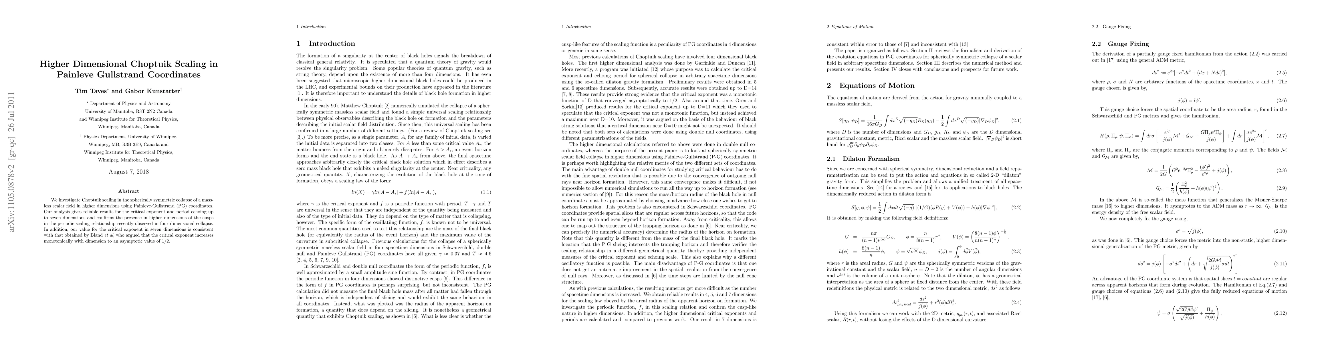 This paper examines Choptuik scaling in higher-dimensional spherically symmetric collapse of a massless scalar field using Painleve-Gullstrand coordinates, confirming the presence of cusps in the scaling relationship and showing that the critical exponent approaches 1/2 as the number of dimensions increases.