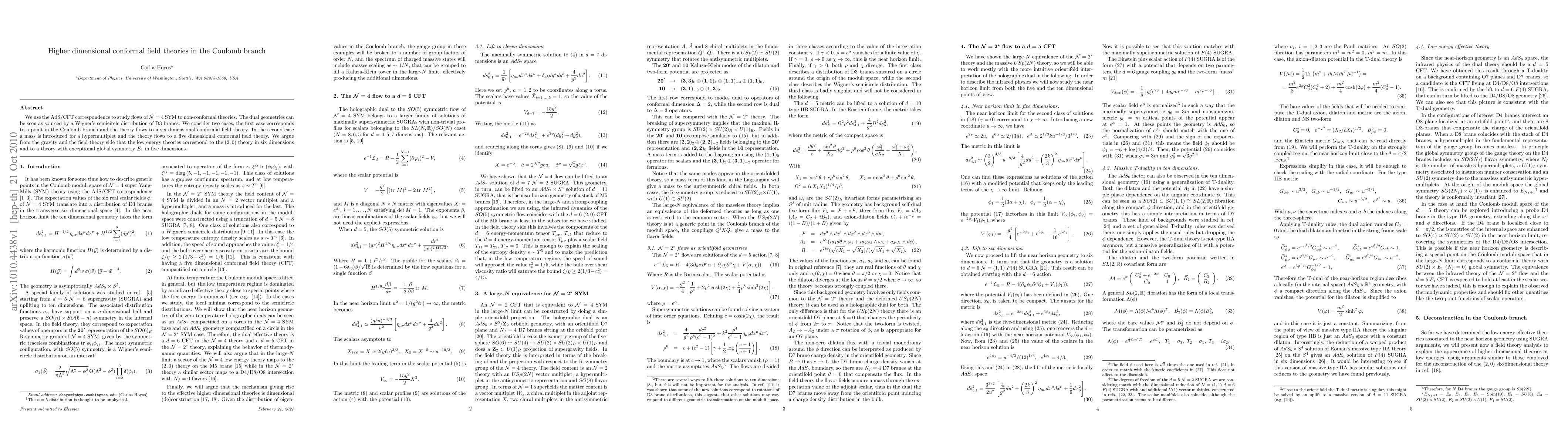 This paper uses the AdS/CFT correspondence to analyze flows from N=4 SYM to non-conformal theories, identifying dual geometries sourced by D3 branes. It finds that in the Coulomb branch, the theory flows to a six-dimensional (2,0) conformal field theory, while introducing a mass leads to a five-dimensional theory with exceptional symmetry $E_1$.