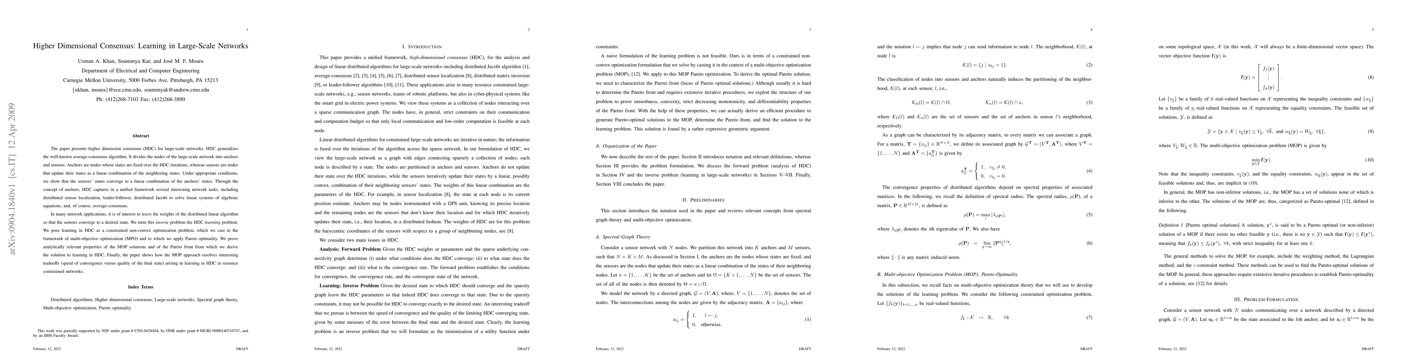 The paper presents higher dimension consensus (HDC) for large-scale networks. HDC generalizes the well-known average-consensus algorithm. It divides the nodes of the large-scale network into anchors and sensors. Anchors are nodes whose states are fixed over the HDC iterations, whereas sensors are nodes that update their states as a linear combination of the neighboring states. Under appropriate conditions, we show that the sensor states converge to a linear combination of the anchor states. Through the concept of anchors, HDC captures in a unified framework several interesting network tasks, including distributed sensor localization, leader-follower, distributed Jacobi to solve linear systems of algebraic equations, and, of course, average-consensus. In many network applications, it is of interest to learn the weights of the distributed linear algorithm so that the sensors converge to a desired state. We term this inverse problem the HDC learning problem. We pose learning in HDC as a constrained non-convex optimization problem, which we cast in the framework of multi-objective optimization (MOP) and to which we apply Pareto optimality. We prove analytically relevant properties of the MOP solutions and of the Pareto front from which we derive the solution to learning in HDC. Finally, the paper shows how the MOP approach resolves interesting tradeoffs (speed of convergence versus quality of the final state) arising in learning in HDC in resource constrained networks.