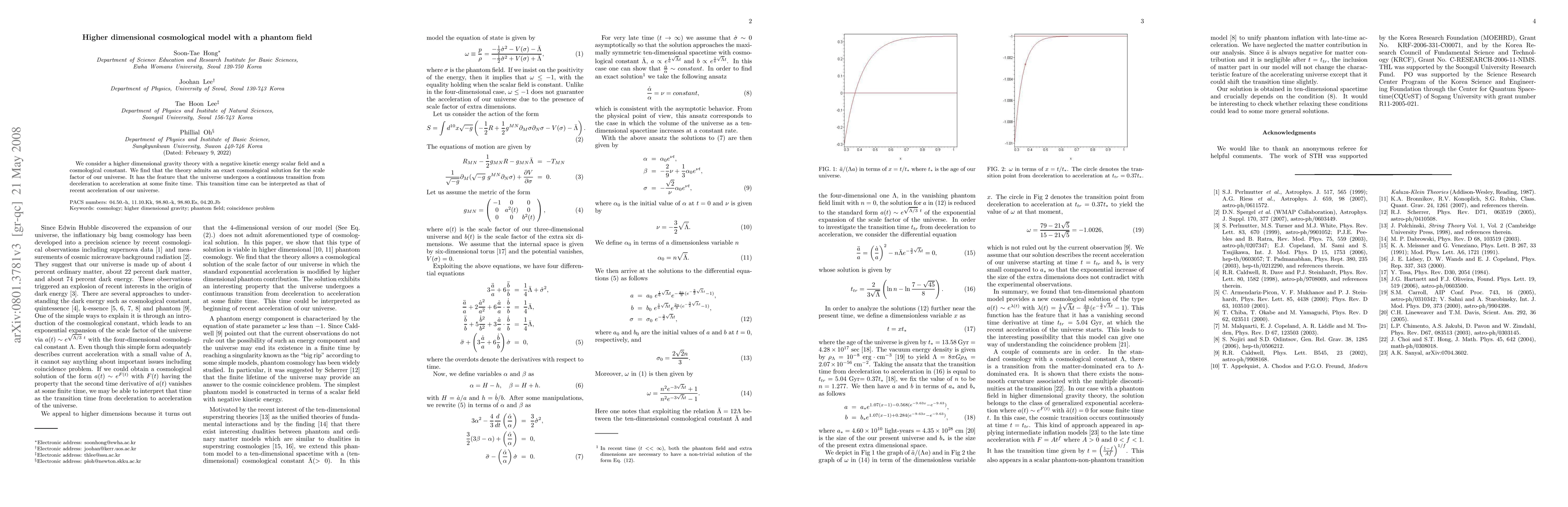 We consider a higher dimensional gravity theory with a negative kinetic energy scalar field and a cosmological constant. We find that the theory admits an exact cosmological solution for the scale factor of our universe. It has the feature that the universe undergoes a continuous transition from deceleration to acceleration at some finite time. This transition time can be interpreted as that of recent acceleration of our universe.