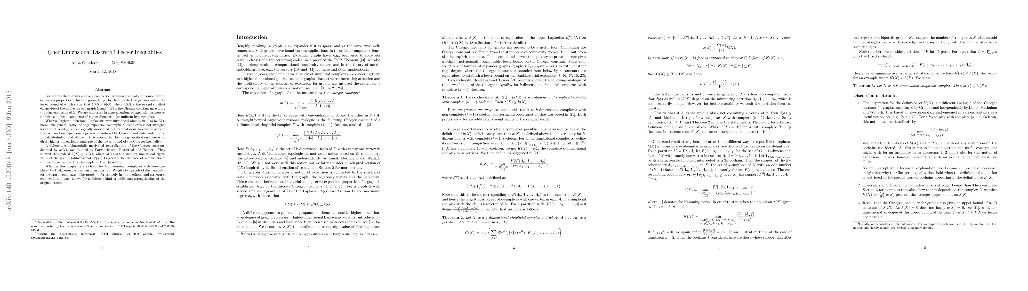 The paper explores higher dimensional discrete Cheeger inequalities, proving that the combinatorially motivated Cheeger constant $h(X)$ provides a lower bound for the smallest non-trivial eigenvalue $\lambda(X)$ of the Laplacian in $k$-dimensional simplicial complexes, even when the $(k-1)$-skeleton is not complete. Two distinct proofs are presented, each offering unique insights and extensions of the original result.
