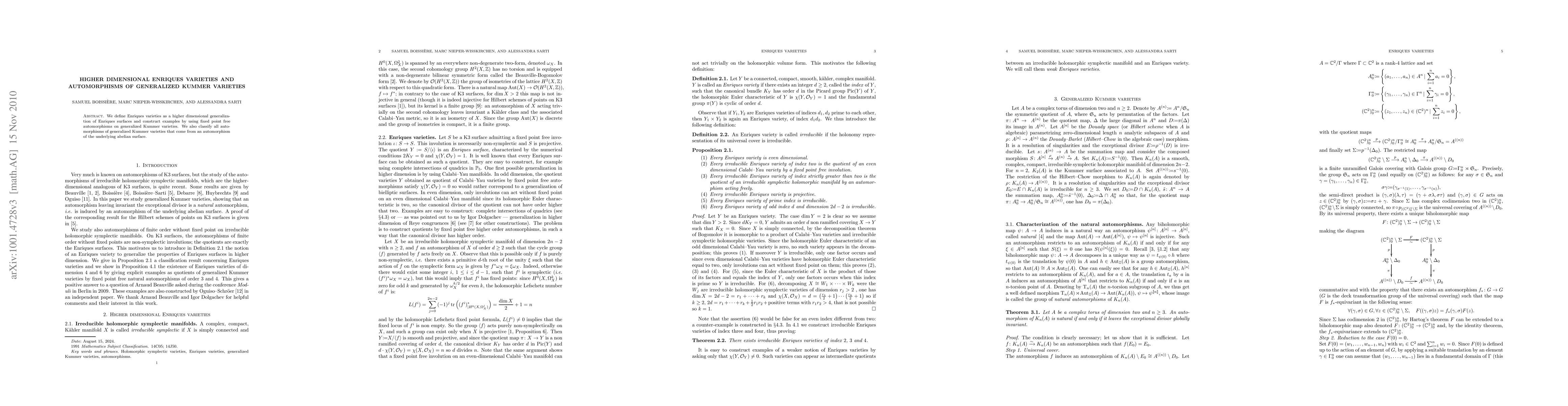 This paper defines higher dimensional Enriques varieties and demonstrates their construction via fixed point free automorphisms on generalized Kummer varieties. Additionally, it classifies all automorphisms of generalized Kummer varieties stemming from the underlying abelian surface.