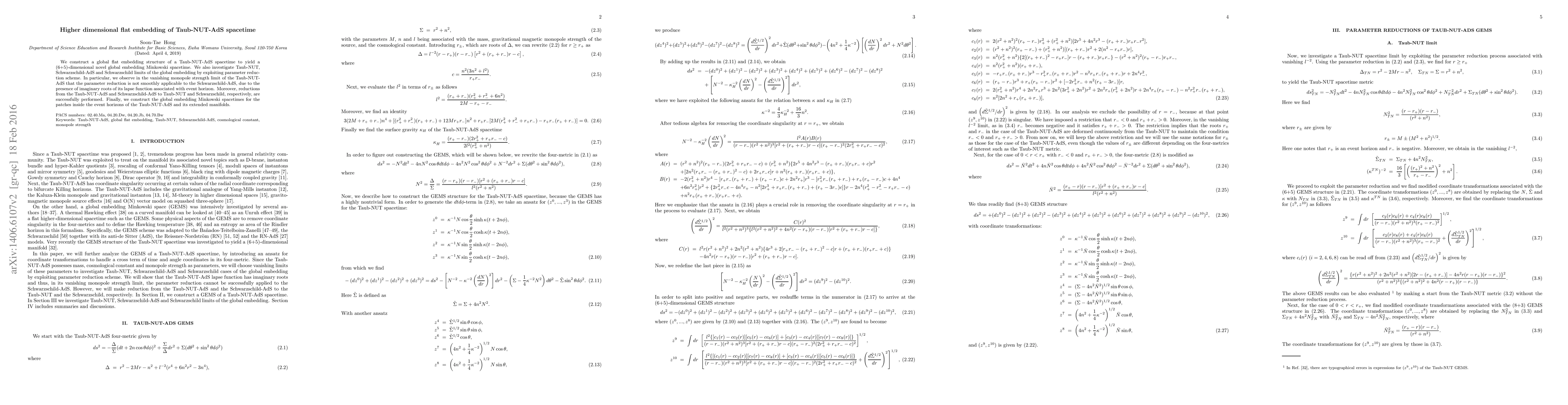 This paper constructs a higher-dimensional flat embedding of Taub-NUT-AdS spacetime, yielding a (6+5)-dimensional Minkowski spacetime, and explores its limits, noting challenges in smoothly reducing to Schwarzschild-AdS due to complex roots in the lapse function. Successful reductions to Taub-NUT and Schwarzschild are also demonstrated.