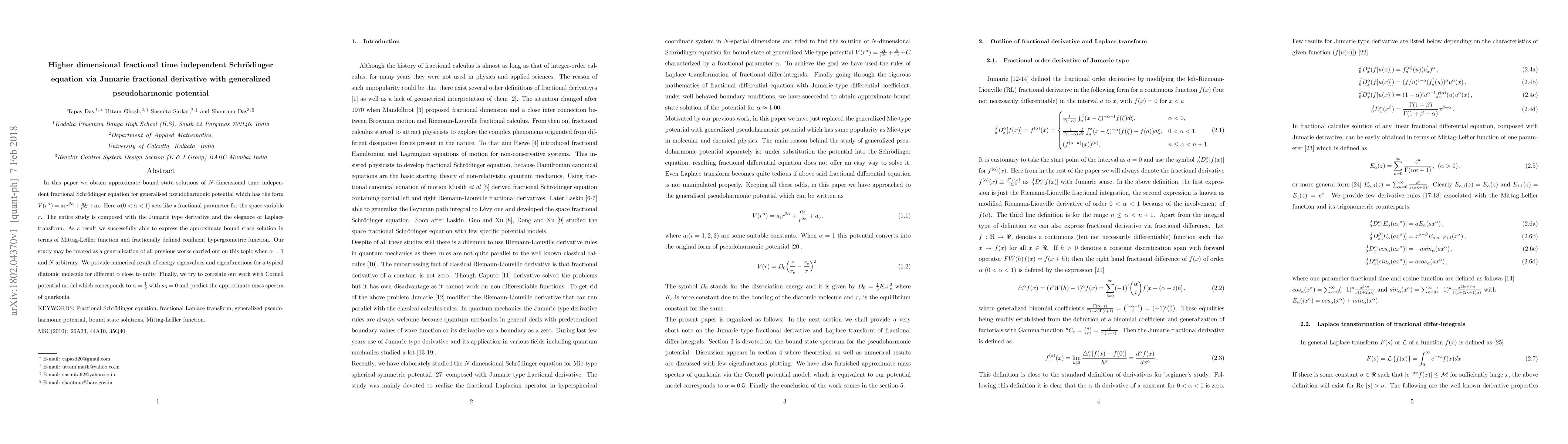 This paper presents approximate solutions for the $N$-dimensional fractional time-independent Schrödinger equation using the Jumarie fractional derivative and generalized pseudoharmonic potential. The study employs Laplace transforms to express solutions in terms of Mittag-Leffler and confluent hypergeometric functions, providing numerical results for energy eigenvalues and eigenfunctions for a diatomic molecule and correlating the findings with the Cornell potential model for quarkonia.