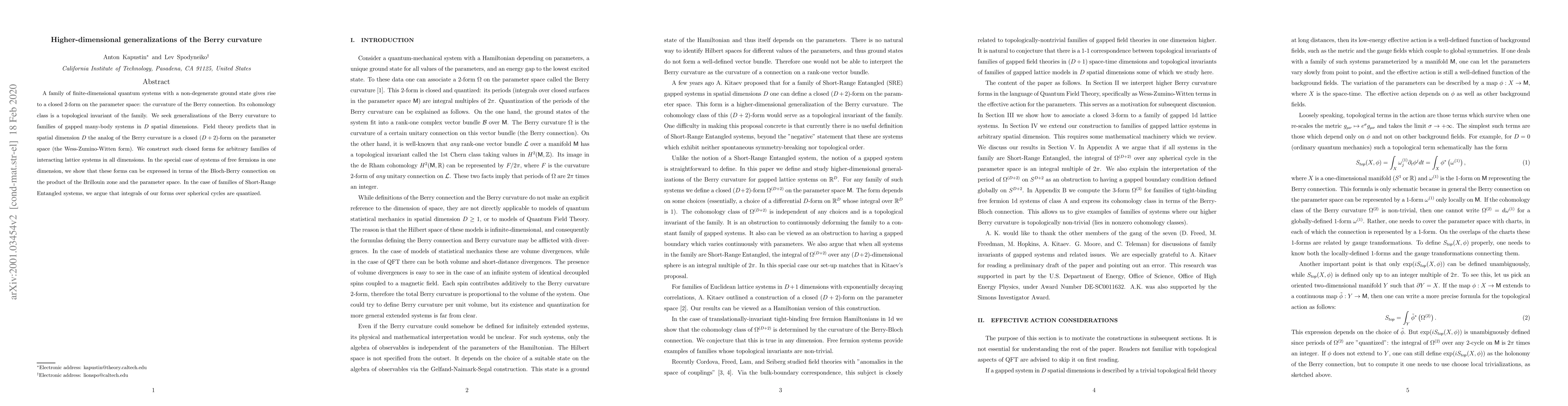 A family of finite-dimensional quantum systems with a non-degenerate ground state gives rise to a closed 2-form on the parameter space: the curvature of the Berry connection. Its cohomology class is a topological invariant of the family. We seek generalizations of the Berry curvature to families of gapped many-body systems in D spatial dimensions. Field theory predicts that in spatial dimension D the analog of the Berry curvature is a closed (D+2)-form on the parameter space (the Wess-Zumino-Witten form). We construct such closed forms for arbitrary families of interacting lattice systems in all dimensions. In the special case of systems of free fermions in one dimension, we show that these forms can be expressed in terms of the Bloch-Berry connection on the product of the Brillouin zone and the parameter space. In the case of families of Short-Range Entangled systems, we argue that integrals of our forms over spherical cycles are quantized.
