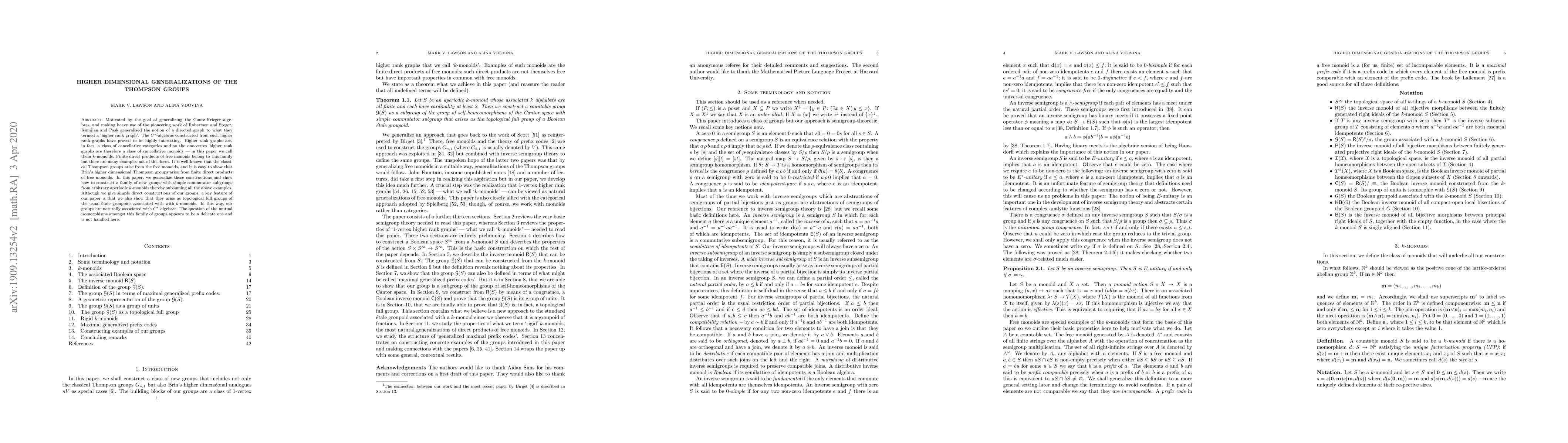 We show how to construct a family of groups with simple commutator subgroups from aperiodic 1-vertex, finitely aligned higher rank graphs (which are, in fact, a class of cancellative monoids). Inverse semigroups form the intermediary between these cancellative monoids and the family of groups we are interested in. These groups can naturally be viewed as higher-dimensional generalizations of the classical Thompson groups since the finite direct products of free monoids are examples of the appropriate 1-vertex higher rank graphs.