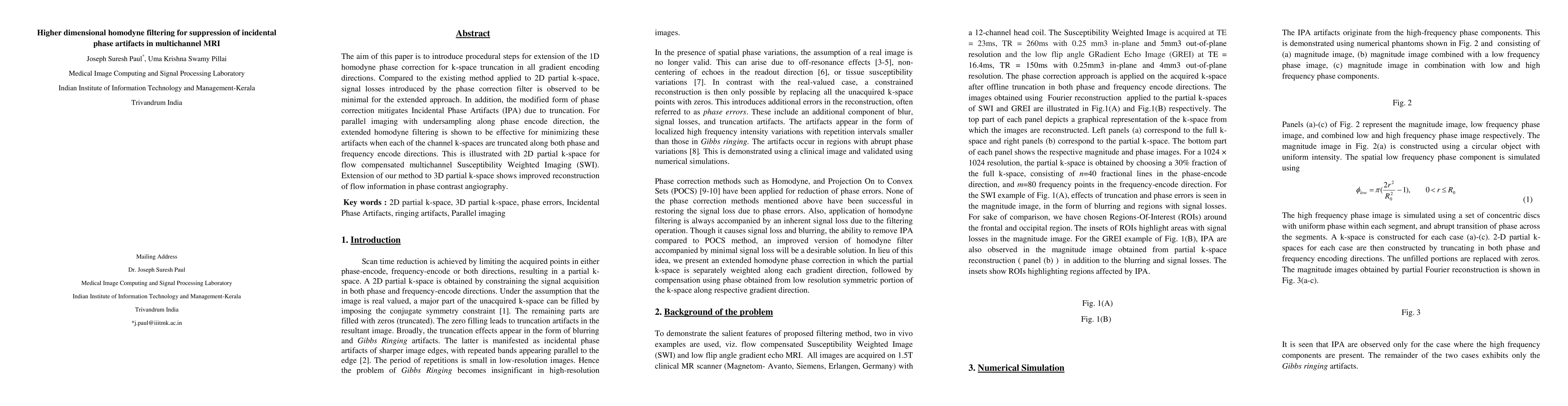 This paper proposes an extension of 1D homodyne phase correction to higher dimensions for minimizing incidental phase artifacts in multichannel MRI, demonstrating minimal signal loss and effective artifact suppression in 2D and 3D partial k-space reconstructions, particularly in Susceptibility Weighted Imaging and phase contrast angiography.