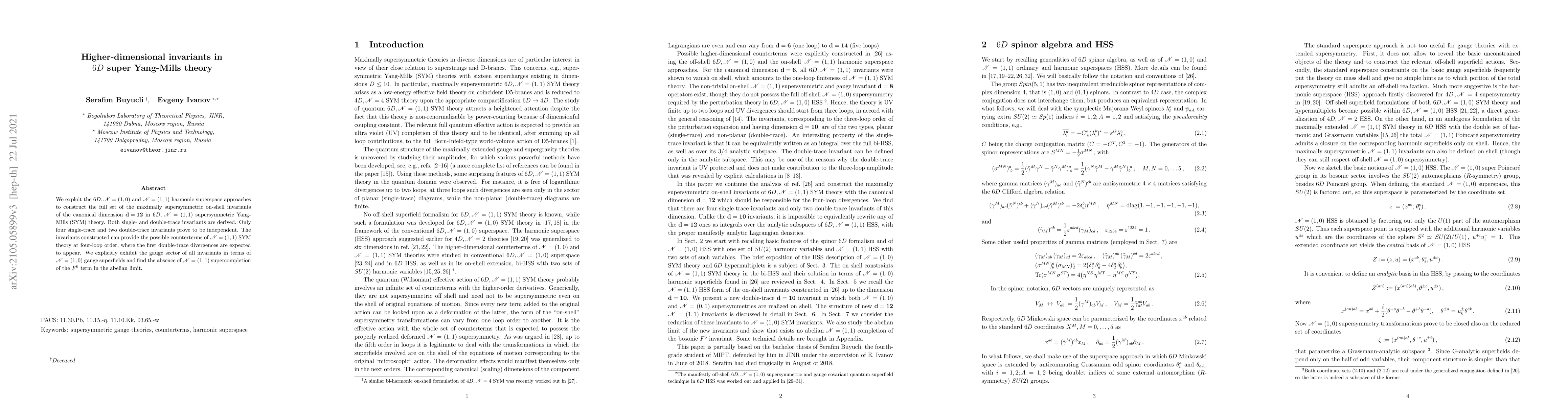 We exploit the $6D, {\cal N}=(1,0)$ and ${\cal N}=(1,1)$ harmonic superspace approaches to construct the full set of the maximally supersymmetric on-shell invariants of the canonical dimension ${\bf d=12}$ in $6D, \,{\cal N}=(1,1)$ supersymmetric Yang-Mills (SYM) theory. Both single- and double-trace invariants are derived. Only four single-trace and two double-trace invariants prove to be independent. The invariants constructed can provide the possible counterterms of ${\cal N}=(1,1)$ SYM theory at four-loop order, where the first double-trace divergences are expected to appear. We explicitly exhibit the gauge sector of all invariants in terms of ${\cal N} = (1, 0)$ gauge superfields and find the absence of ${\cal N}=(1,1)$ supercompletion of the $F^6$ term in the abelian limit.