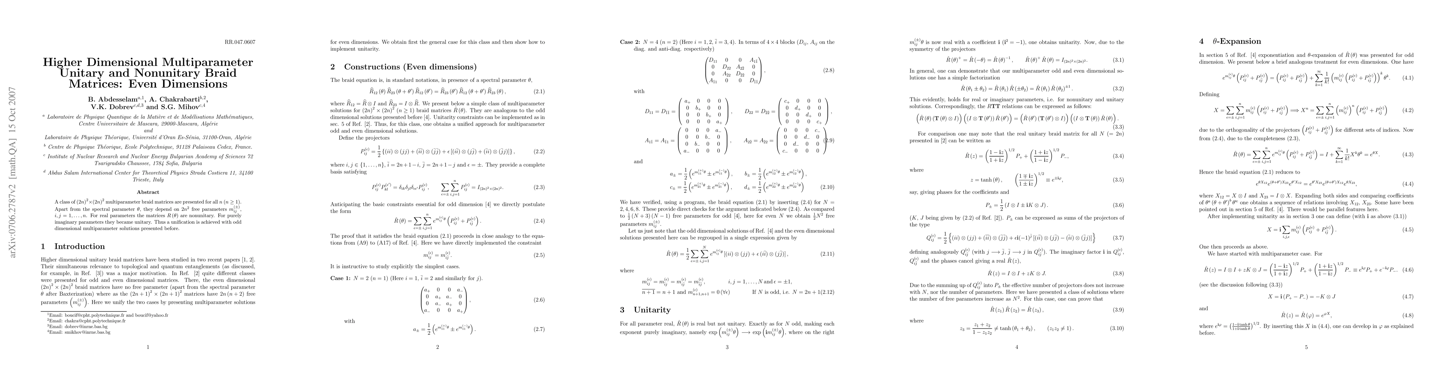 This paper introduces $(2n)^2\times(2n)^2$ multiparameter braid matrices for even dimensions, which are nonunitary for real parameters and unitary for purely imaginary parameters, unifying previous odd-dimensional solutions.