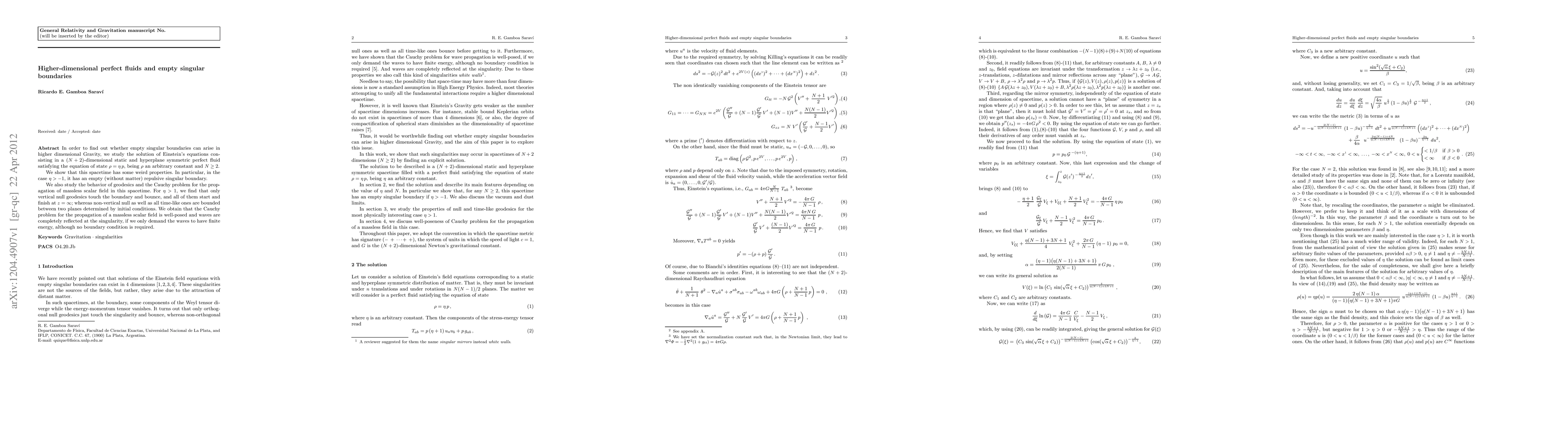 In order to find out whether empty singular boundaries can arise in higher dimensional Gravity, we study the solution of Einstein's equations consisting in a ($N+2$)-dimensional static and hyperplane symmetric perfect fluid satisfying the equation of state $\rho=\eta\, p$, being $\rho$ an arbitrary constant and $N\geq2$. We show that this spacetime has some weird properties. In particular, in the case $\eta>-1$, it has an empty (without matter) repulsive singular boundary. We also study the behavior of geodesics and the Cauchy problem for the propagation of massless scalar field in this spacetime. For $\eta>1$, we find that only vertical null geodesics touch the boundary and bounce, and all of them start and finish at $z=\infty$; whereas non-vertical null as well as all time-like ones are bounded between two planes determined by initial conditions. We obtain that the Cauchy problem for the propagation of a massless scalar field is well-posed and waves are completely reflected at the singularity, if we only demand the waves to have finite energy, although no boundary condition is required.