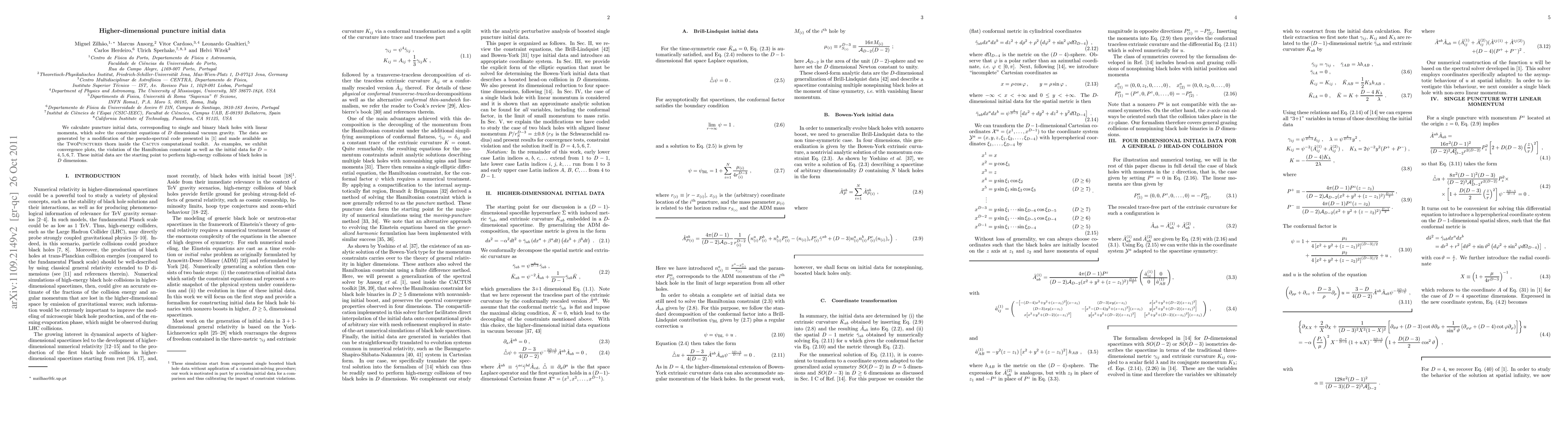 We calculate puncture initial data, corresponding to single and binary black holes with linear momenta, which solve the constraint equations of D dimensional vacuum gravity. The data are generated by a modification of the pseudo-spectral code presented in arXiv:gr-qc/0404056 and made available as the TwoPunctures thorn inside the Cactus computational toolkit. As examples, we exhibit convergence plots, the violation of the Hamiltonian constraint as well as the initial data for D=4,5,6,7. These initial data are the starting point to perform high energy collisions of black holes in D dimensions.