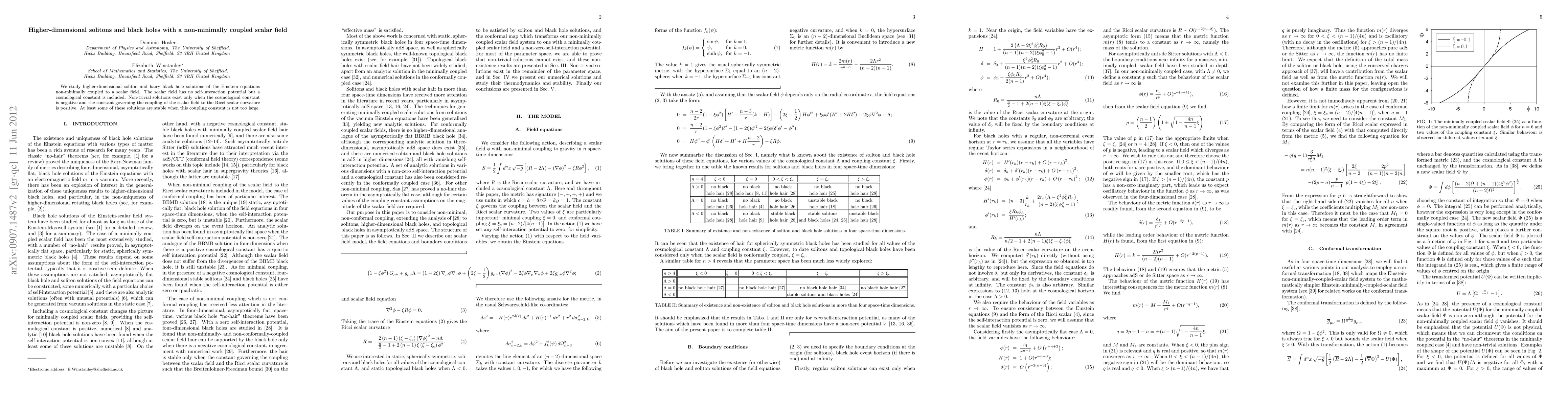 This paper investigates higher-dimensional solitons and hairy black holes influenced by a non-minimally coupled scalar field, revealing that non-trivial solutions only exist with a negative cosmological constant and a positive coupling constant. Stability of some solutions is maintained under certain conditions.