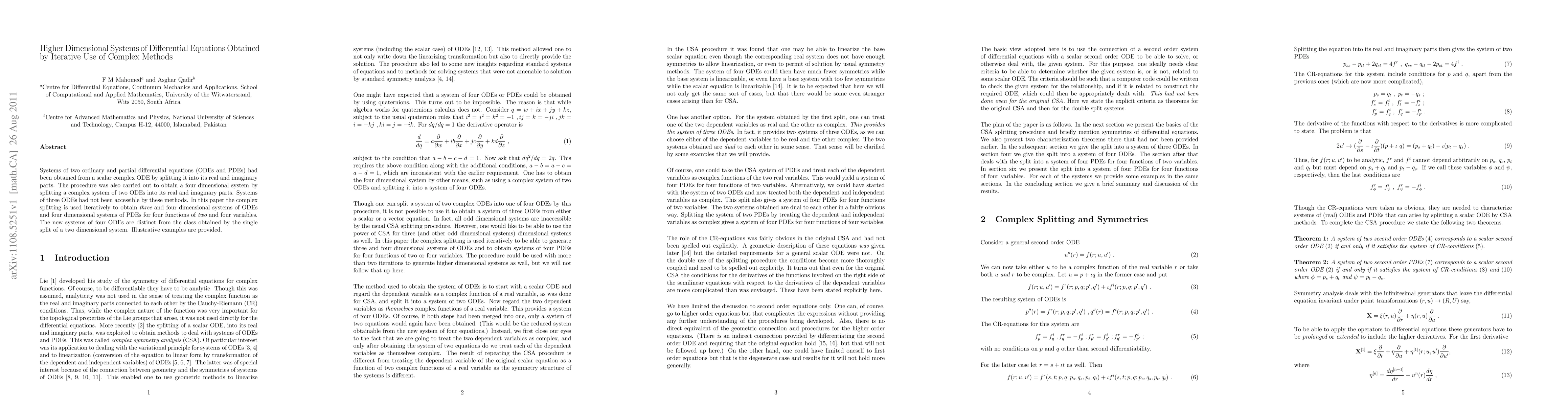 Systems of two ordinary and partial differential equations (ODEs and PDEs) had been obtained from a scalar complex ODE by splitting it into its real and imaginary parts. The procedure was also carried out to obtain a four dimensional system by splitting a complex system of two ODEs into its real and imaginary parts. Systems of three ODEs had not been accessible by these methods. In this paper the complex splitting is used iteratively to obtain three and four dimensional systems of ODEs and four dimensional systems of PDEs for four functions of two and four variables. The new systems of four ODEs are distinct from the class obtained by the single split of a two dimensional system. Illustrative examples are provided.