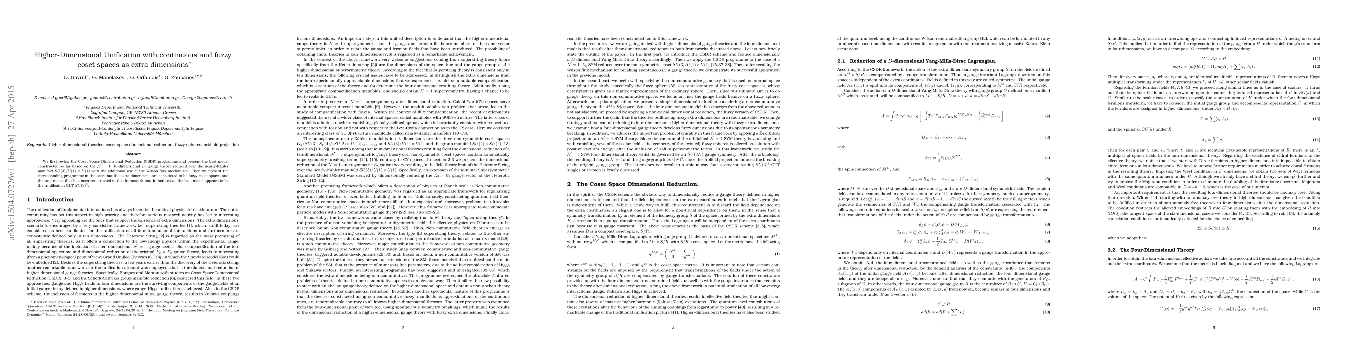 This paper reviews the Coset Space Dimensional Reduction (CSDR) programme, focusing on the best model derived from a 10-dimensional $E_8$ gauge theory reduced over a $SU(3)/U(1)\times U(1)$ manifold using Wilson flux. It also explores the same unification in the context of fuzzy coset spaces, concluding that the trinification GUT $SU(3)^3$ is optimal in both scenarios.