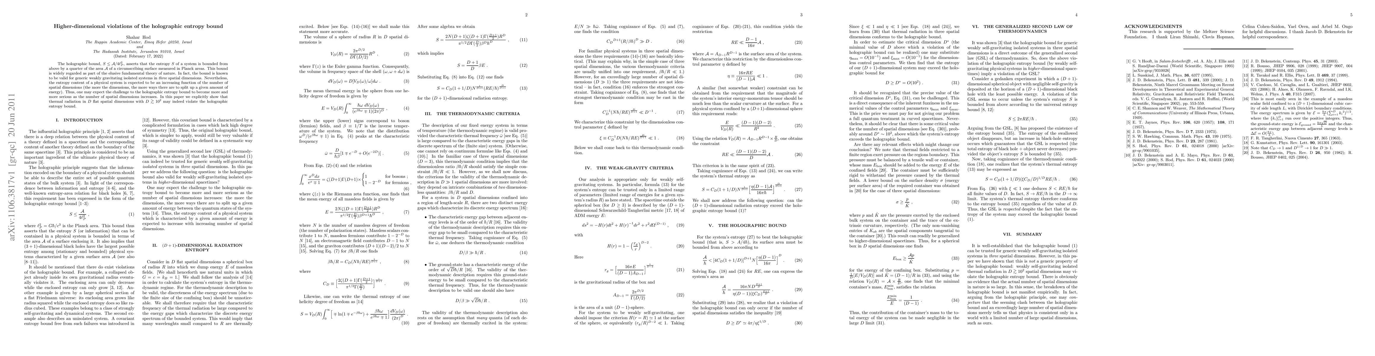 The holographic bound, $S<=A/4{\ell^2_P}$, asserts that the entropy $S$ of a system is bounded from above by a quarter of the area $A$ of a circumscribing surface measured in Planck areas. This bound is widely regarded as part of the elusive fundamental theory of nature. In fact, the bound is known to be valid for generic weakly gravitating isolated systems in {\it three} spatial dimensions. Nevertheless, the entropy content of a physical system is expected to be an increasing function of the number of spatial dimensions (the more the dimensions, the more ways there are to split up a given amount of energy). Thus, one may expect the challenge to the holographic entropy bound to become more and more serious as the number of spatial dimensions increases. In this paper we explicitly show that thermal radiation in $D$ flat spatial dimensions with $D\gtrsim 10^2$ may indeed violate the holographic entropy bound.