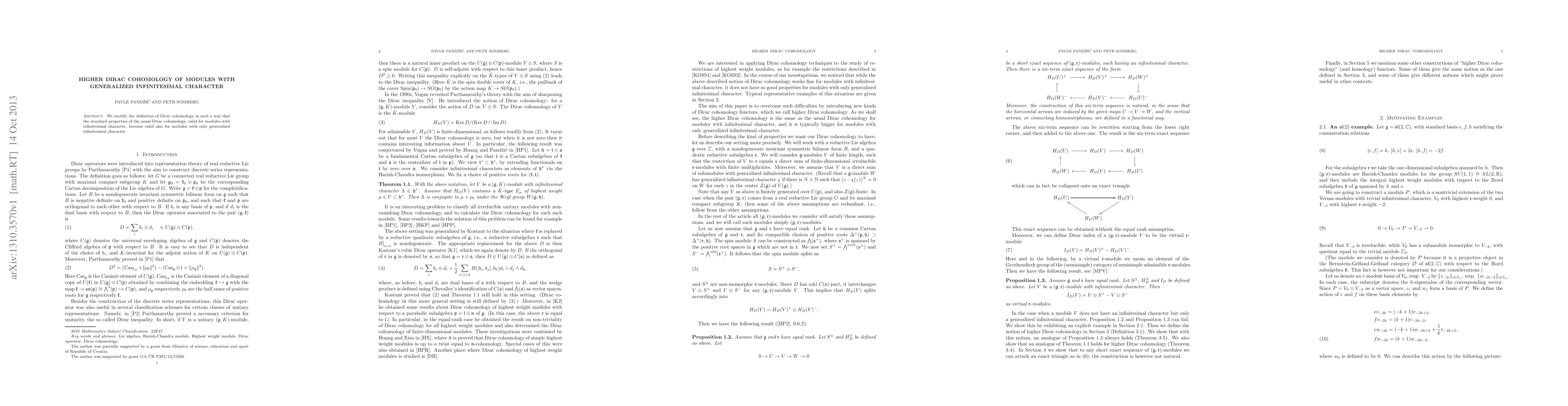 Summary: This paper redefines Dirac cohomology to extend its standard properties from modules with infinitesimal character to those with generalized infinitesimal character. The new definition retains the essential features of the original concept while broadening its applicability.