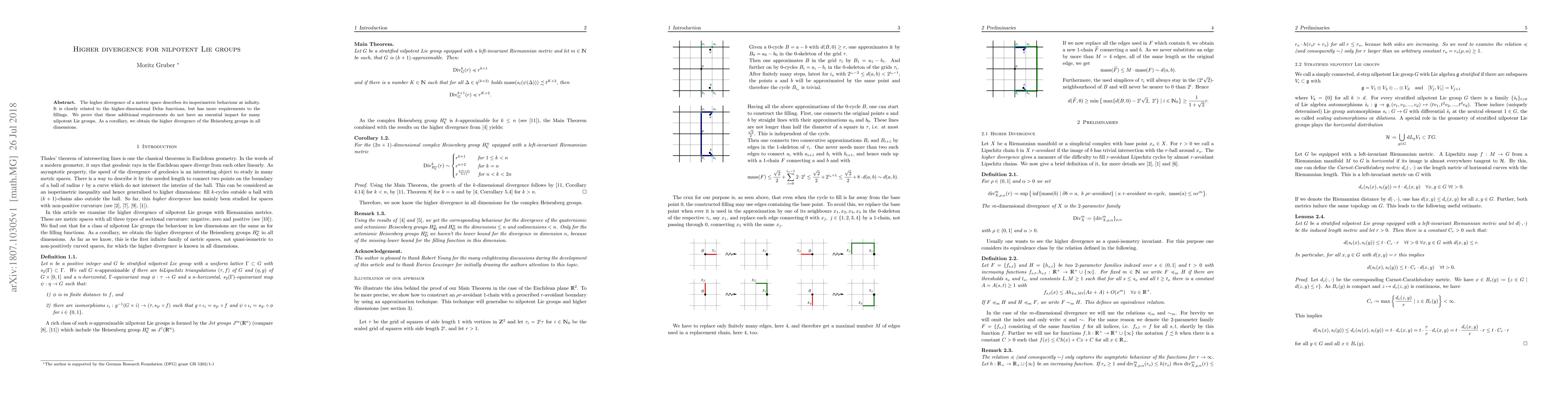 The higher divergence of a metric space describes its isoperimetric behaviour at infinity. It is closely related to the higher-dimensional Dehn functions, but has more requirements to the fillings. We prove that these additional requirements do not have an essential impact for many nilpotent Lie groups. As a corollary, we obtain the higher divergence of the Heisenberg groups in all dimensions.