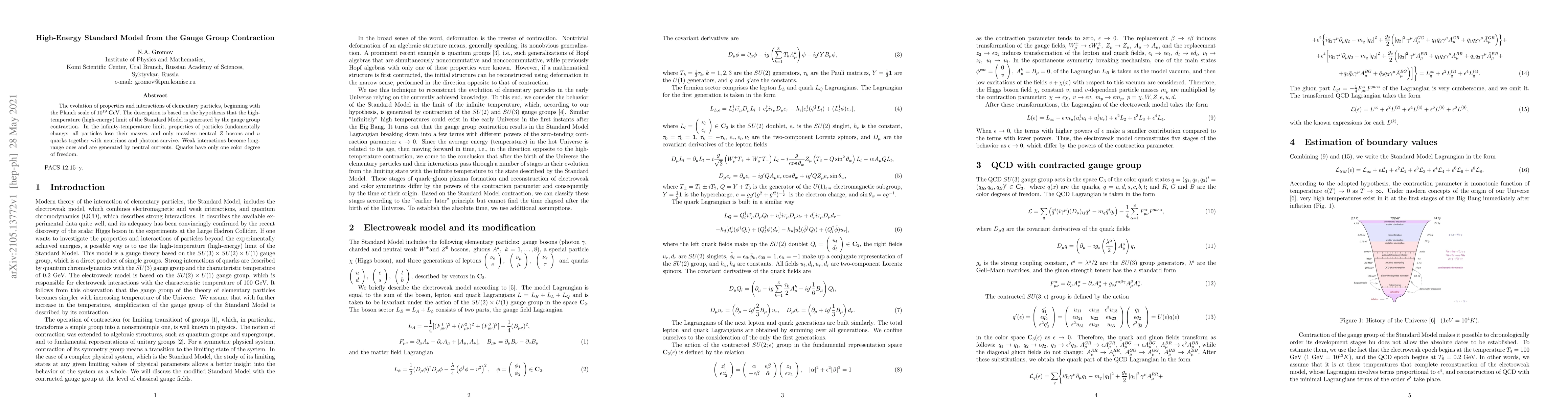 The evolution of properties and interactions of elementary particles is described, beginning with the Planck scale of $10^{19}$ GeV. The description is based on the hypothesis that high-temperature (high-energy) limit of the Standard Model is generated by the gauge group contraction. In the infinite-temperature limit, properties of particles fundamentally change: all particles lose their masses, only massless neutral $Z$ bosons and $u$ quarks together with neutrinos and photons survive. Weak interactions become long-range ones and are generated by neutral currents. Quarks have only one color degree of freedom.