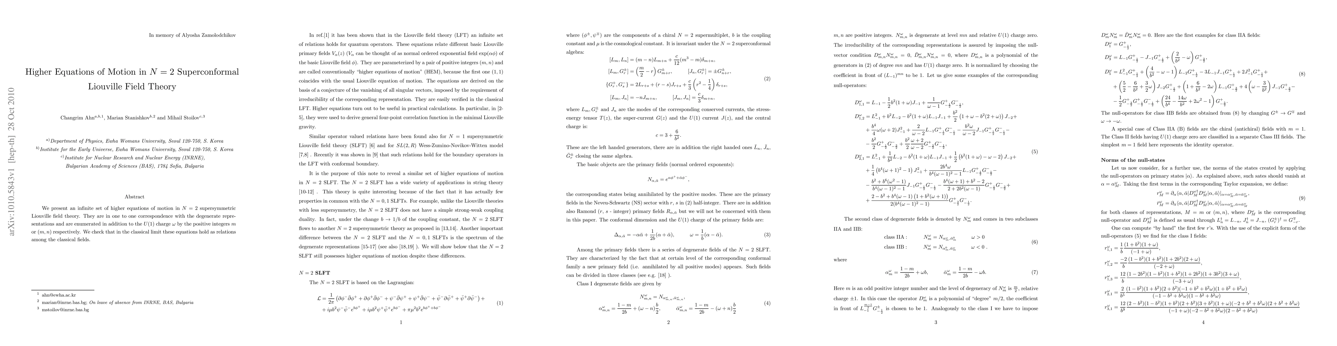 We present an infinite set of higher equations of motion in N=2 supersymmetric Liouville field theory. They are in one to one correspondence with the degenerate representations and are enumerated in addition to the U(1) charge \omega by the positive integers m or (m,n) respectively. We check that in the classical limit these equations hold as relations among the classical fields.